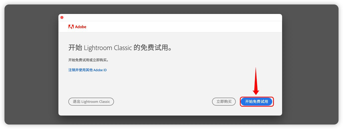 安装完成后,运行Lightroom Classic,选择试用,并在试用提示中选择“忽略”,如果跳出购买页面直接关闭