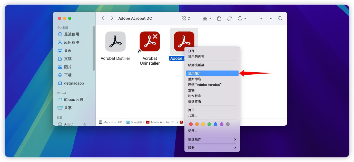 1.我们需要进入应用程序,找到「Adobe Acrobat DC」文件夹,再打开。找到「Adobe Acrobat.app」右键显示简介