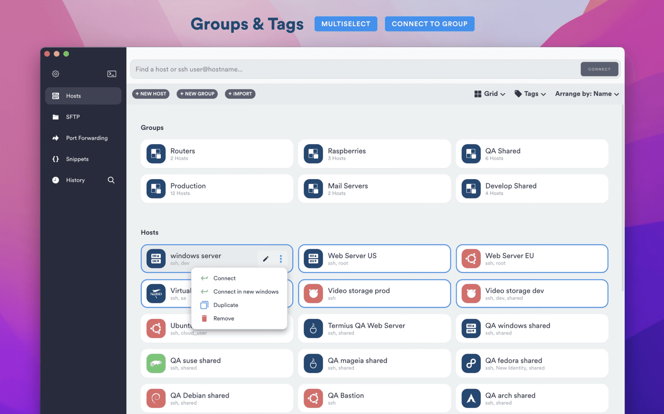 🖥️ 多服务器管理:标签页分组管理开发/生产环境主机,颜色标记异常实例