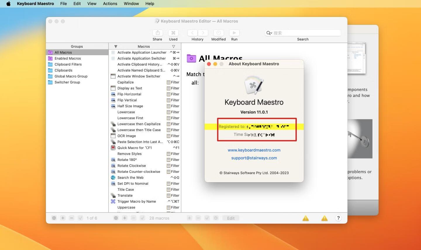 运行软件Keyboard Maestro,到菜单栏,点击Register Keyboard Maestro...