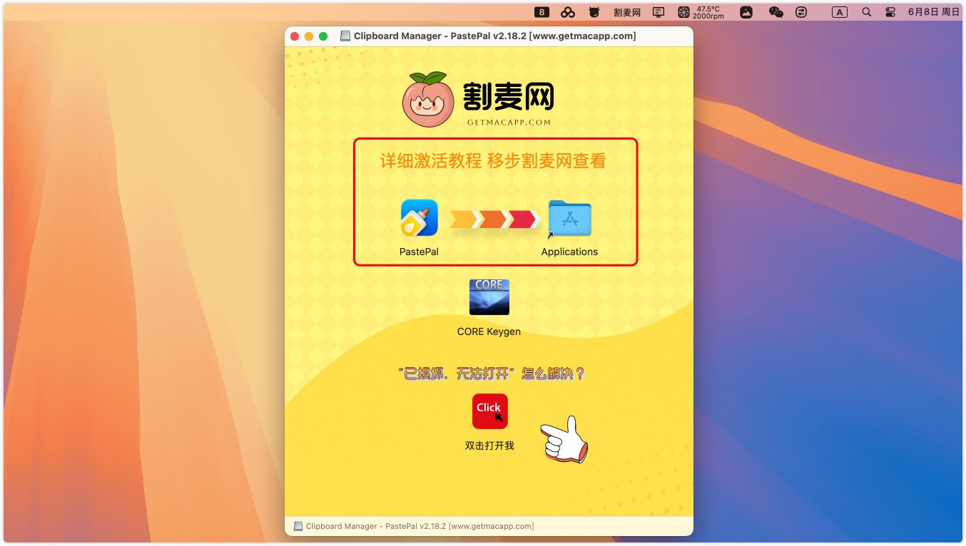 1.双击安装包,将左侧pastepal拖到右侧Applications即可