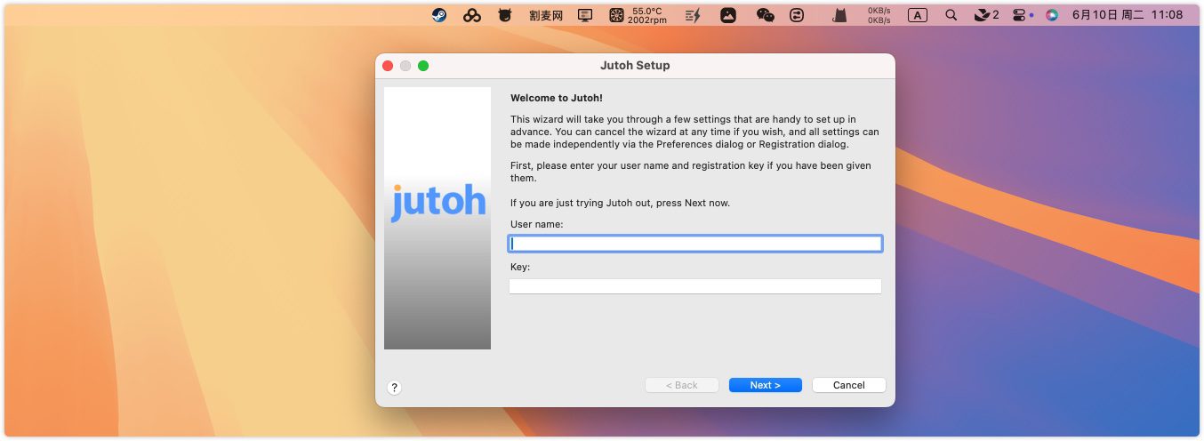 运行软件,自行弹出注册页面如图:(或者打开软件,在左上角菜单栏Help中选择Register Jutoh...进入注册页面)
