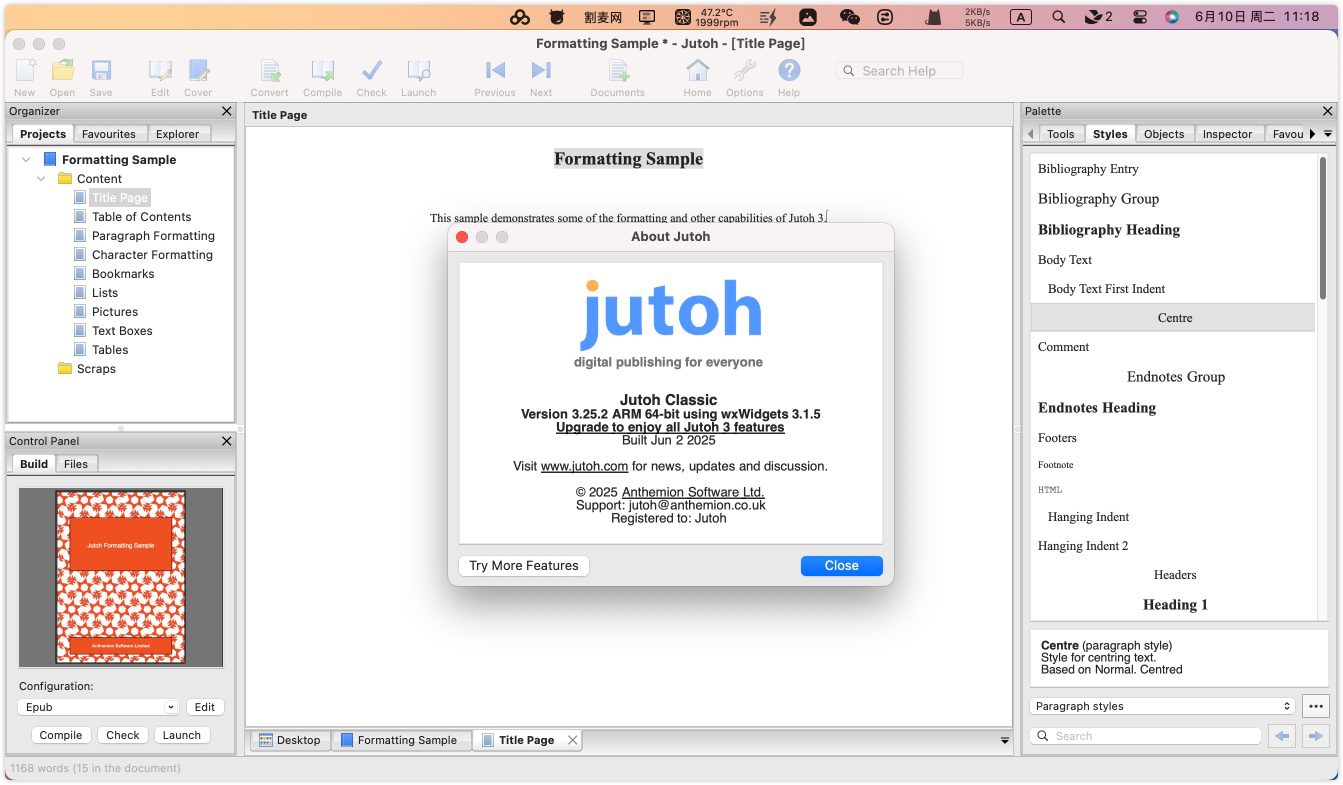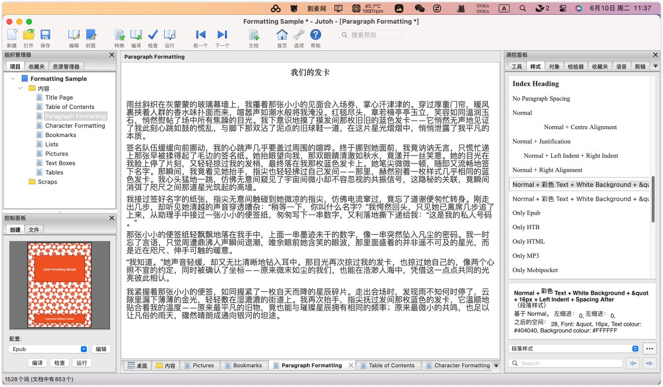 Jutoh for Mac是专为数字出版设计的专业电子书创作工具,支持小说、指南、诗歌等全品类内容制作。它不仅能将现有文档转换为主流电子书格式,还提供从零创作的完整解决方案。与其他工具相比,Jutoh的核心差异化在于深度优化电子书特性:智能编译检测、多平台适配代码生成、语音导出支持,以及独创的“配置”系统实现一书多版本输出,彻底解决作者跨平台发布的兼容性痛点。