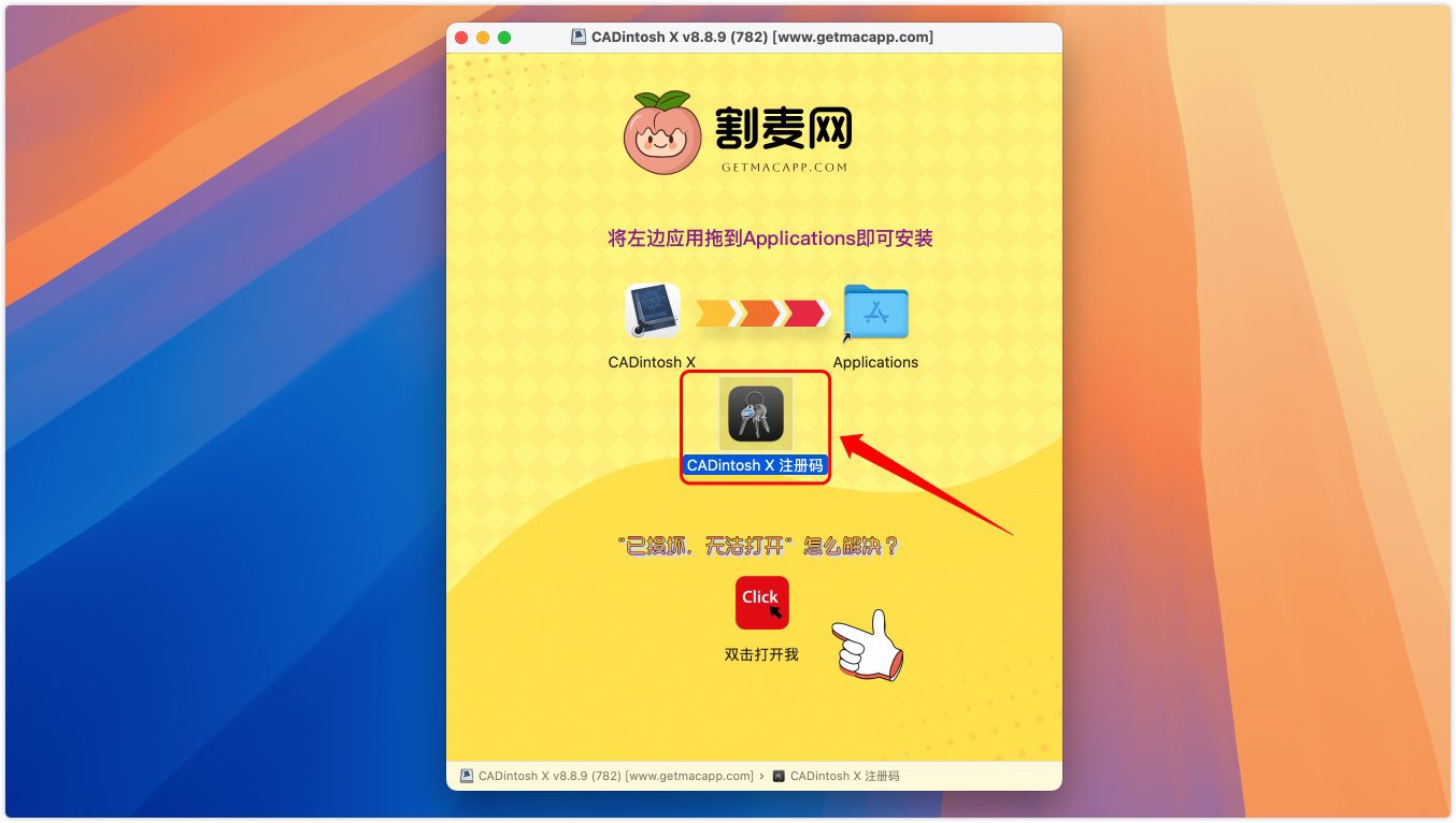 CADintosh X 安装包下载好后,打开安装包,把左侧CADintosh X软件拖动到右边应用程序完成安装。