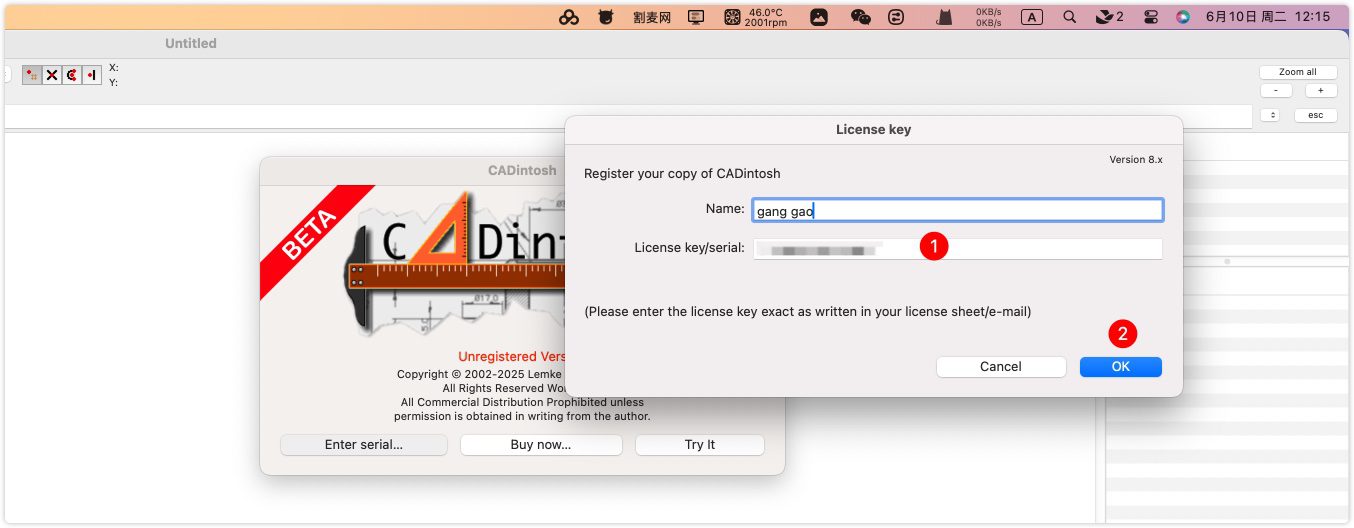 然后name输入gang gao,下面粘贴CADintosh X 8注册码,完成后点击ok,即可!
