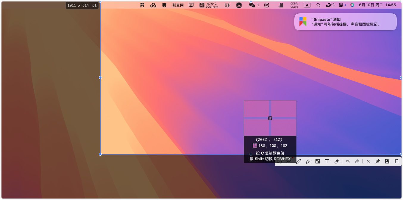 在鼠标选区状态下,Snipaste还支持取色,按c键就可以复制鼠标当前的颜色值,适合设计师和前端开发人员。