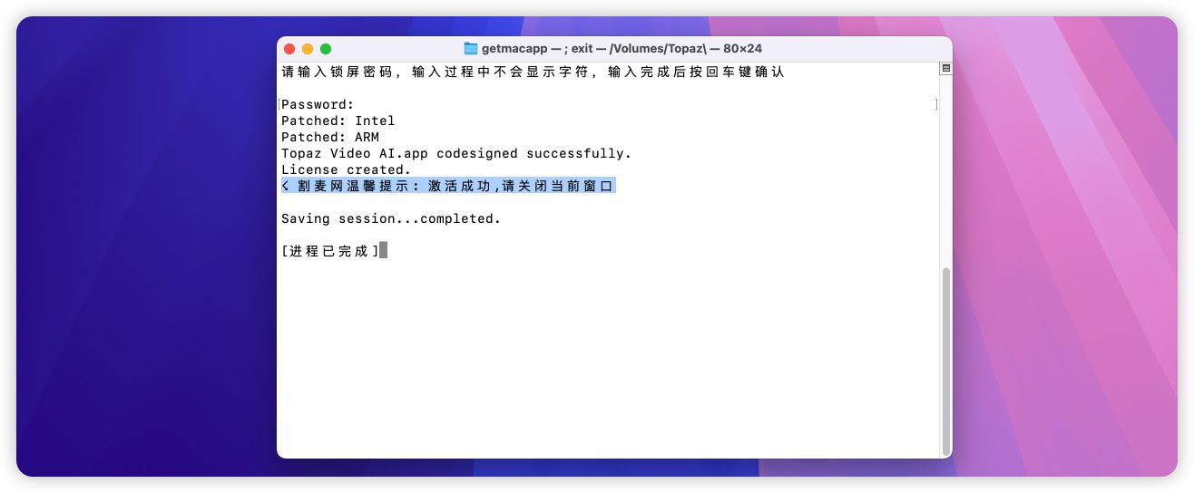 2. 双击破解补丁,输入开机密码完成破解,成功下图所示