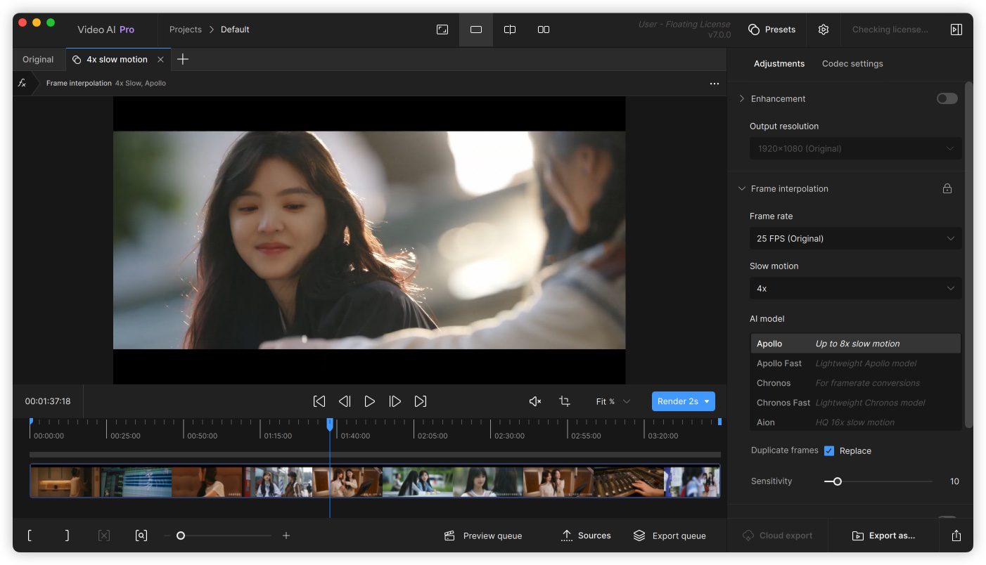 🔄 帧率智能转换:Chronos AI模型可插入中间帧,实现24fps→60fps流畅转换,慢动作效果无卡顿,媲美原生拍摄。