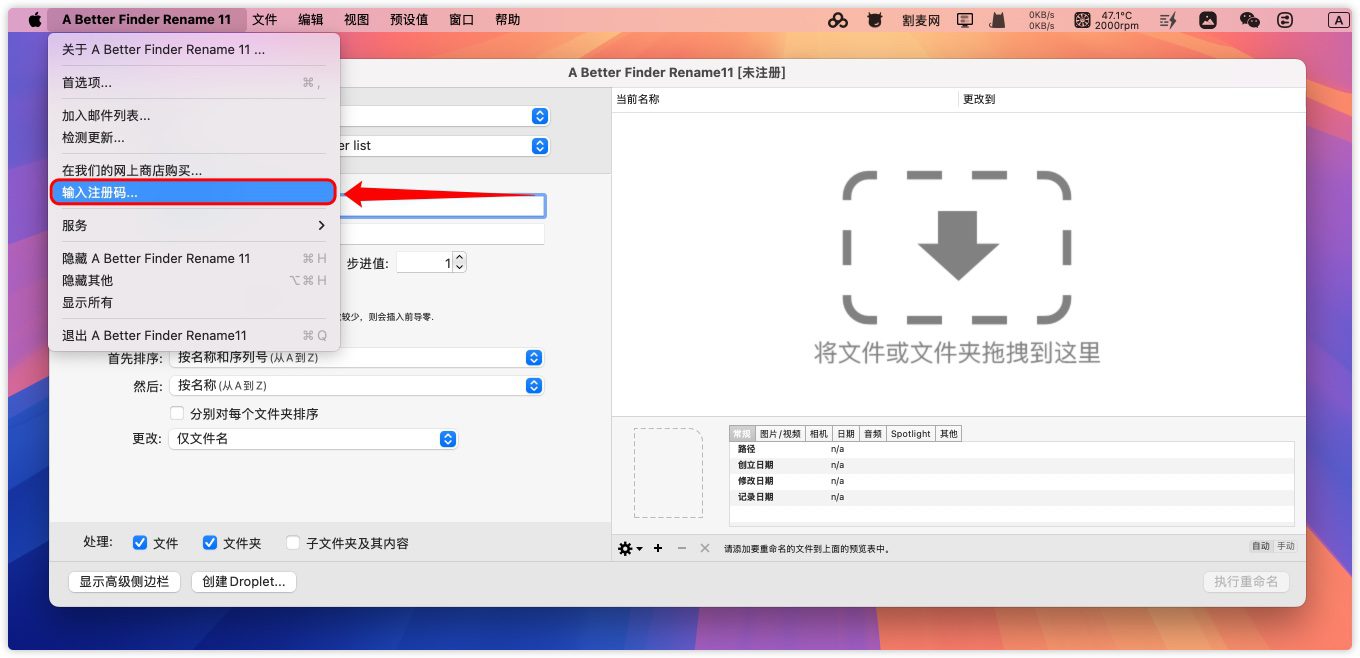2.运行A Better Finder Rename 11,点击左上角菜单栏的【输入注册码...】。
