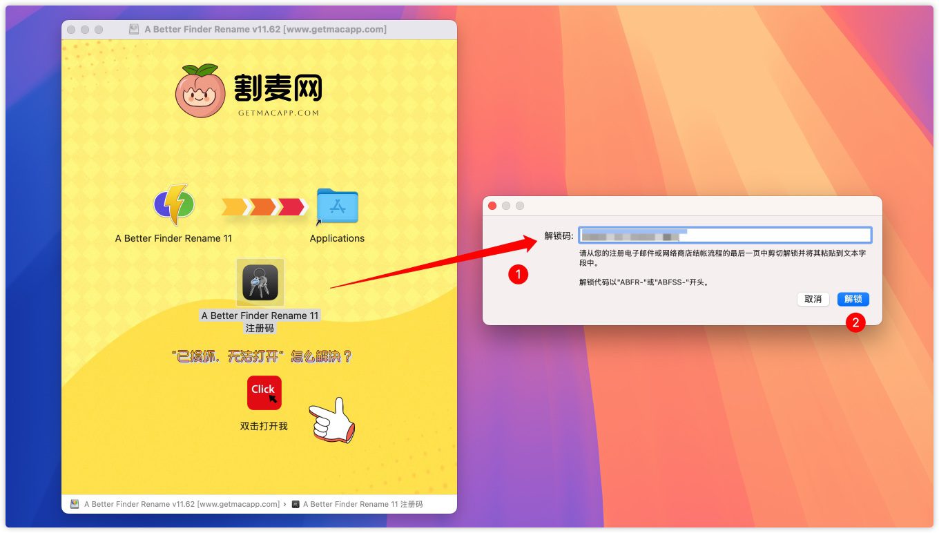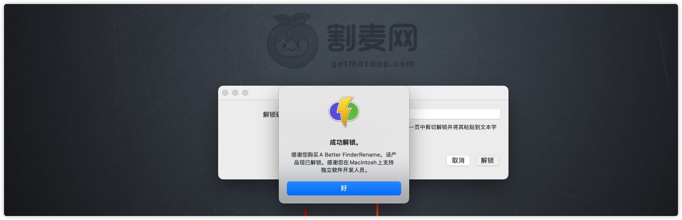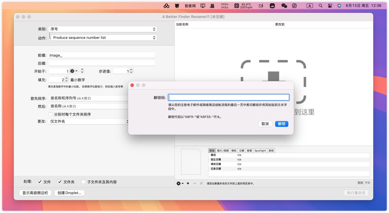 将A Better Finder Rename 注册码复制粘贴到A Better Finder Rename 11注册界面,然后点击【解锁】。