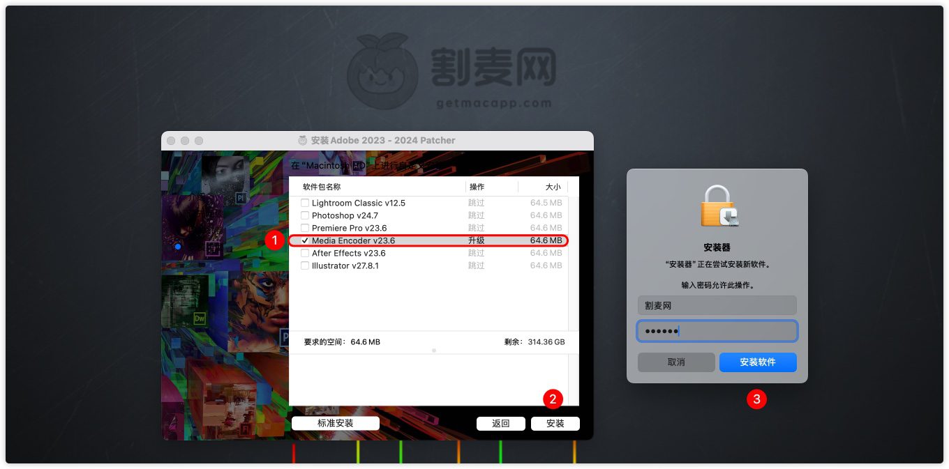 点击自定义【必须】, 只勾选☑️ Media Encoder v23.6, 然后点击安装, 输入锁屏密码等待完成即可