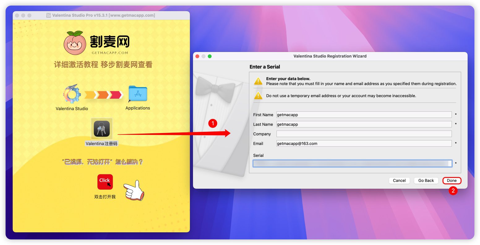 打开注册码,分别输入对应的Frist name、Last Name、email、注册码,点击Done即可