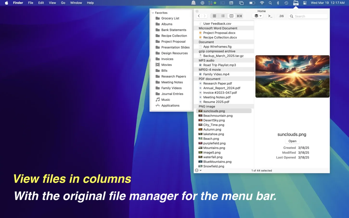 💎 File Cabinet Pro是一款深度集成于菜单栏的极简文件管理器,彻底告别杂乱Finder窗口!它以零桌面干扰为核心优势,支持直接通过菜单栏完成文件打开、重命名、压缩、标记等全流程操作,独创内置多格式预览编辑能力,让用户无需启动额外应用即可处理文本、图像、音视频文件,重新定义Mac高效文件管理体验。