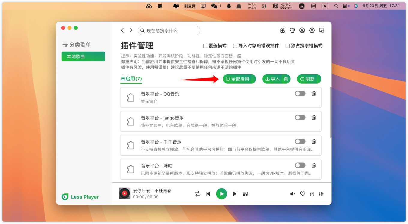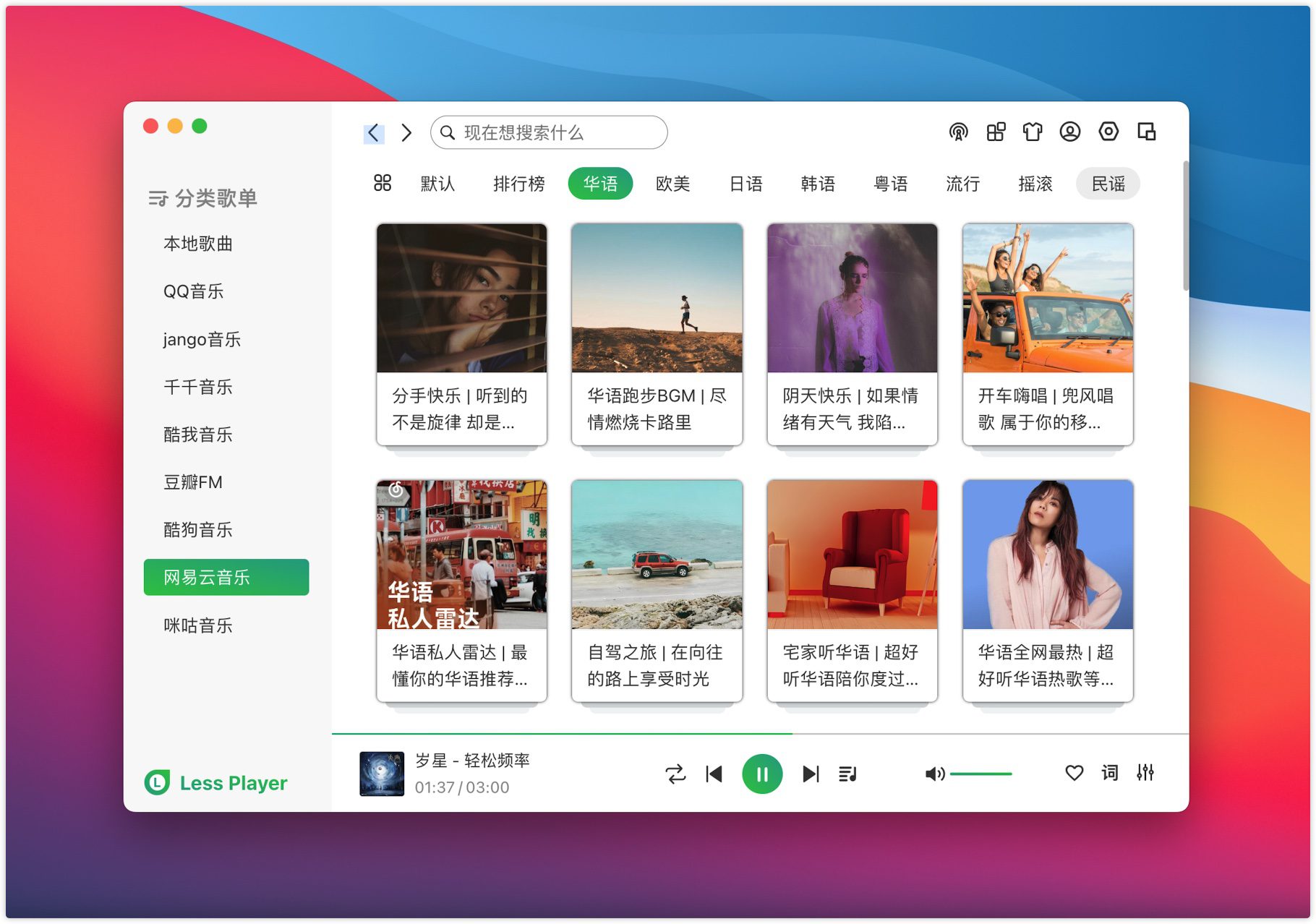 Less Player是一款基于Electron和Vue 3开发的聚合型音乐播放器,专为Mac用户打造。它突破传统播放器的平台限制,无缝集成QQ音乐、网易云、酷我、酷狗等六大主流音源,实现“一站式”跨平台音乐管理。其核心差异化在于免会员解锁全网无损音质🎶,并支持本地与在线歌单混合播放,解决了音乐爱好者多平台切换的痛点。简洁的插件化设计兼顾轻量化与可扩展性,成为Mac生态中稀缺的全能听歌利器。