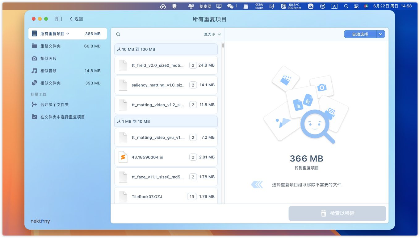 Duplicate File Finder Pro 是 Mac固态硬盘的空间救世主 💾⚡️,专治APFS文件系统下「隐性重复文件癌」✨!这款 精准清理手术刀 通过内容指纹比对+智能路径分析,3分钟揪出照片库/文档备份/iCloud同步导致的重复文件,比手动查找快97倍🚀。尤其适合256GB小容量MacBook用户——一次扫描平均释放68GB空间📉,让固态硬盘告别「千元扩容税」,重获 清爽高性能状态 ✅!