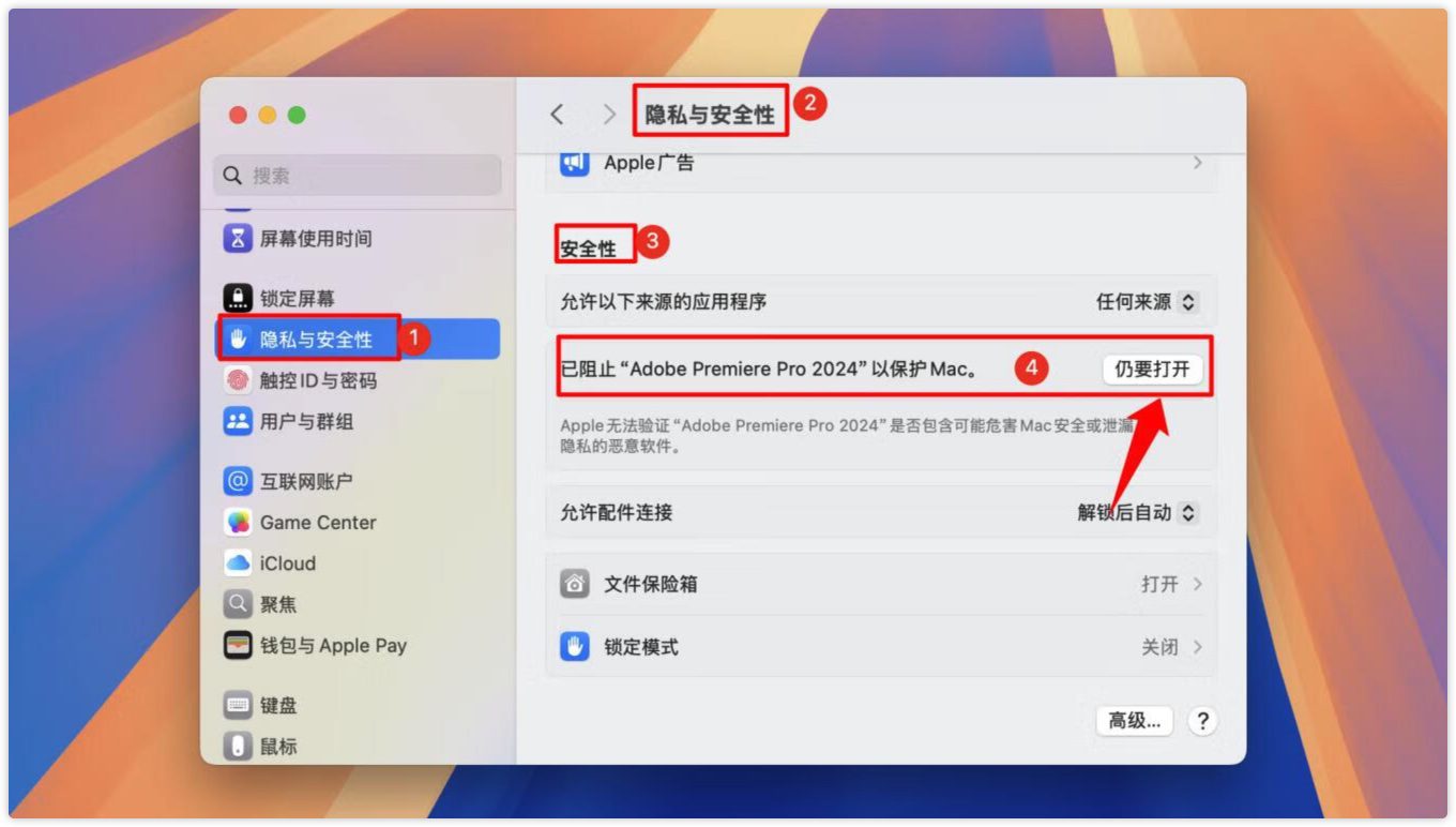 ⚠️安装前先开启电脑【系统偏好设置】-【安全与隐私】 中的 【任何来源】 选项