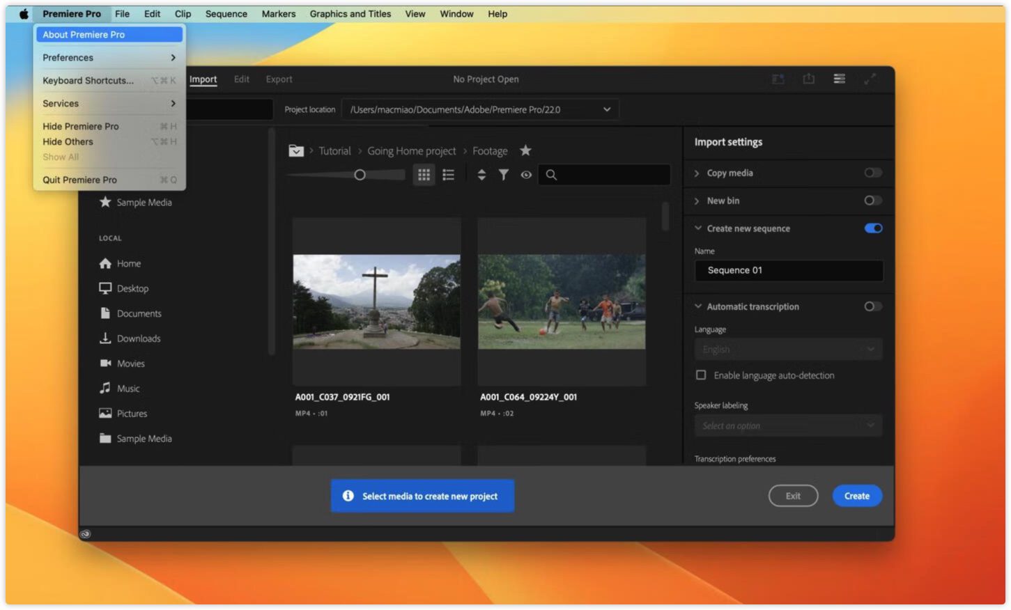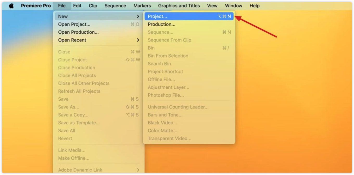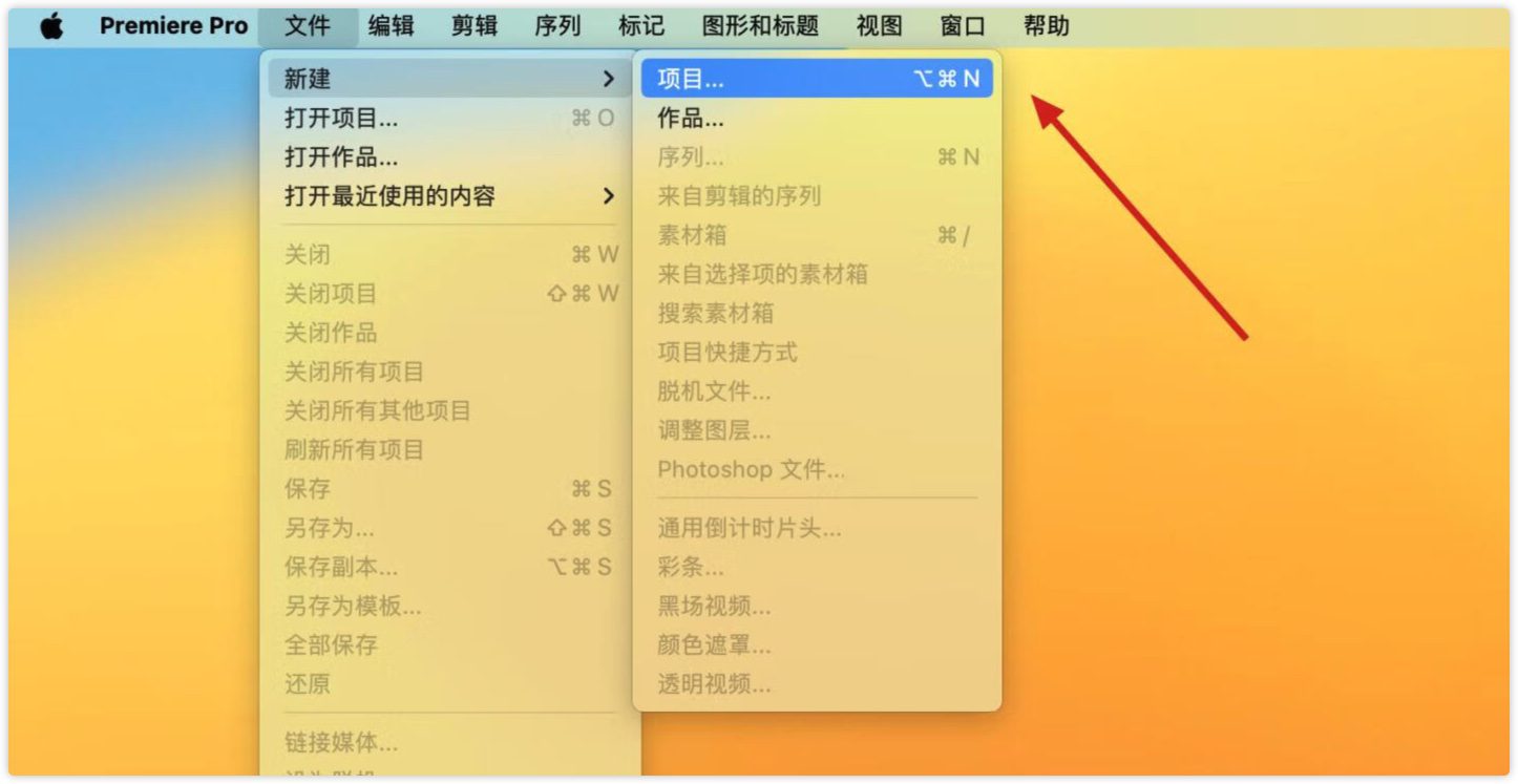 此时打开 pr 后,桌面无启动界面,并不是没有启动而且没有欢迎界面窗口,顶部菜单栏--选择新建工程即可