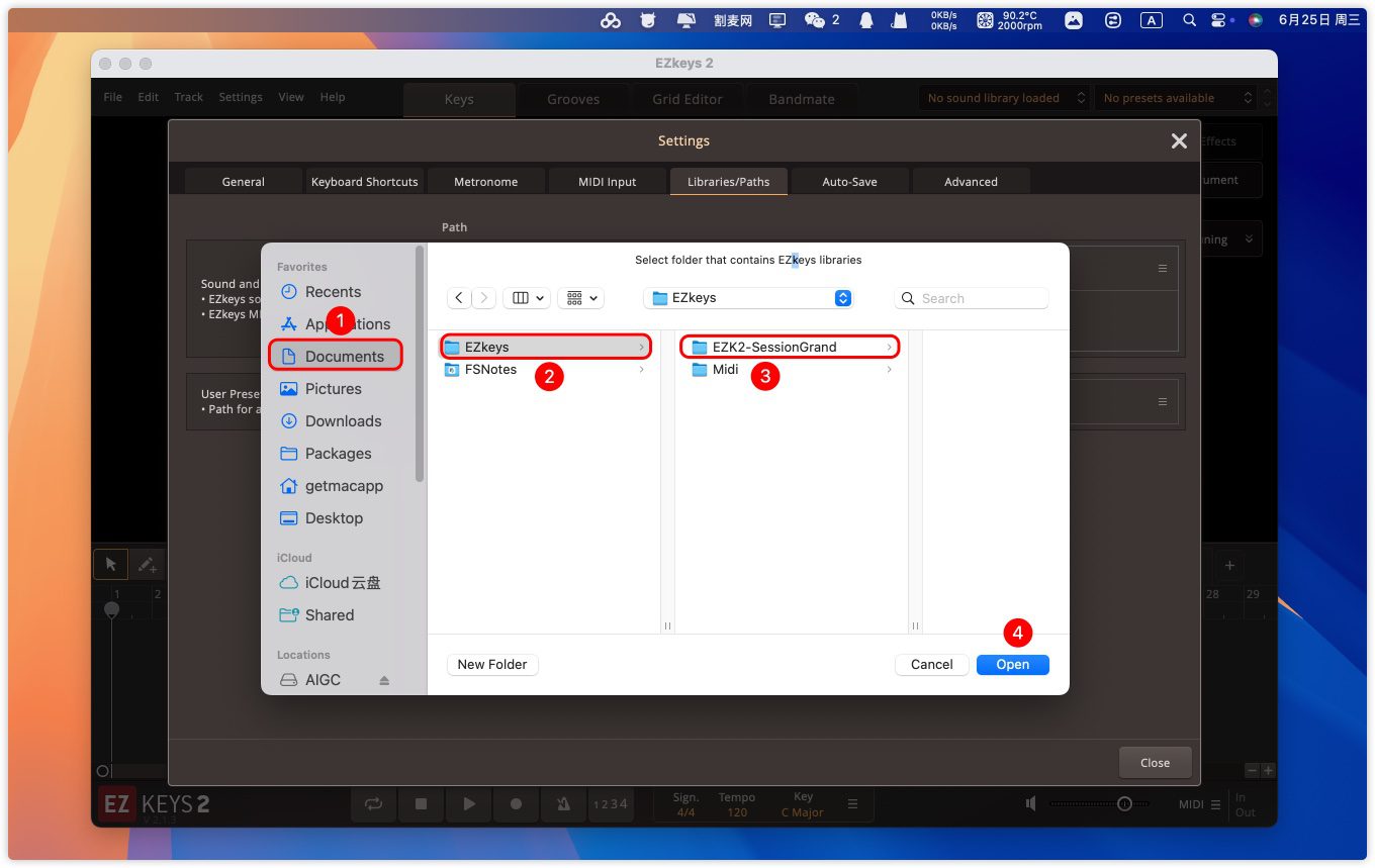 找到拖放到文档的资源库,以分栏模式参看,选择EZK2-SessionGrand文件夹,点击OPEN