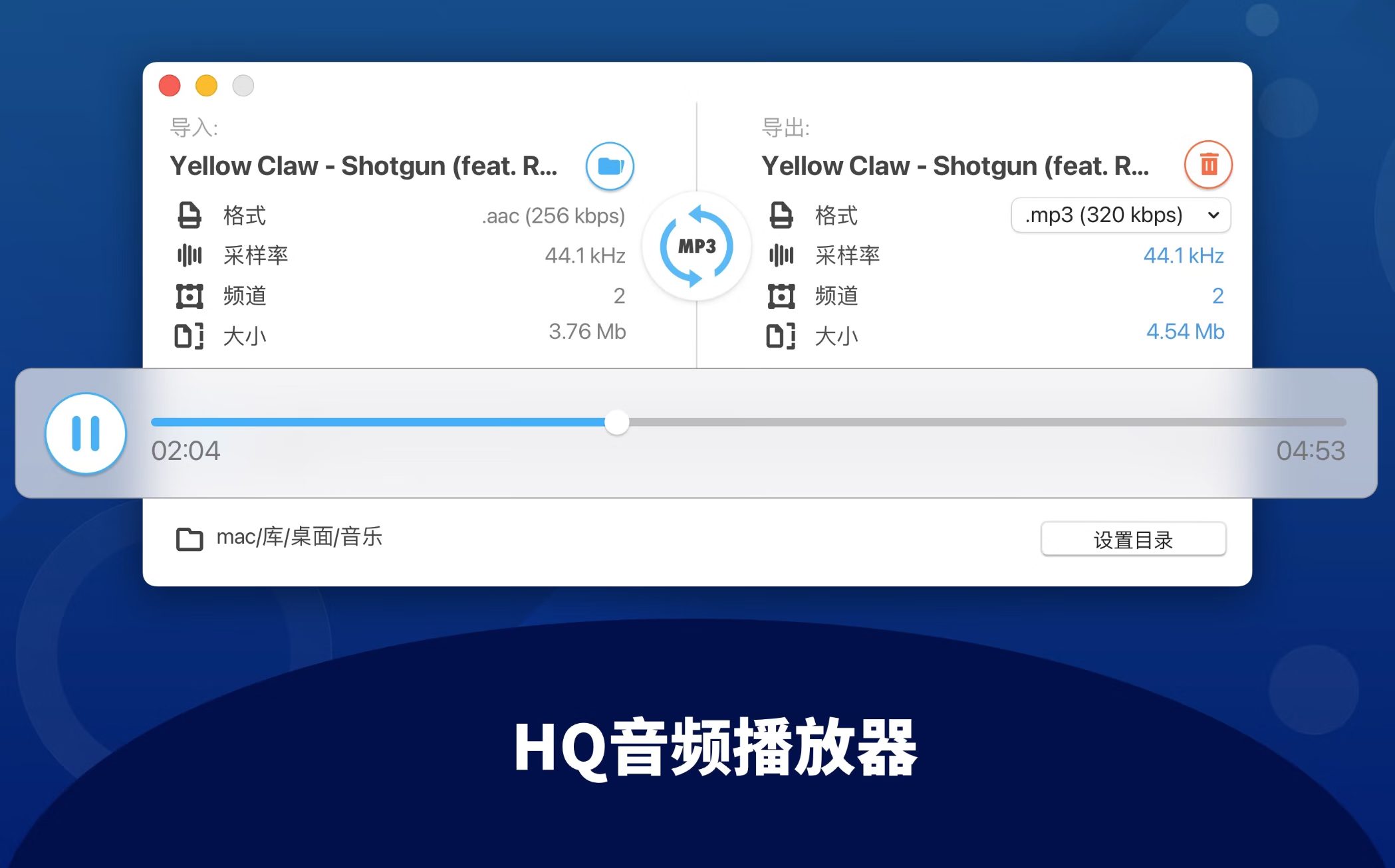 自定义输出设置:灵活调整比特率(128-320kbps)、采样率(44.1-96kHz)及声道(单声道/立体声); -