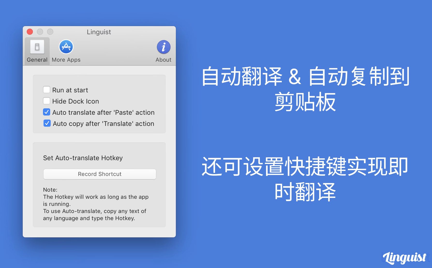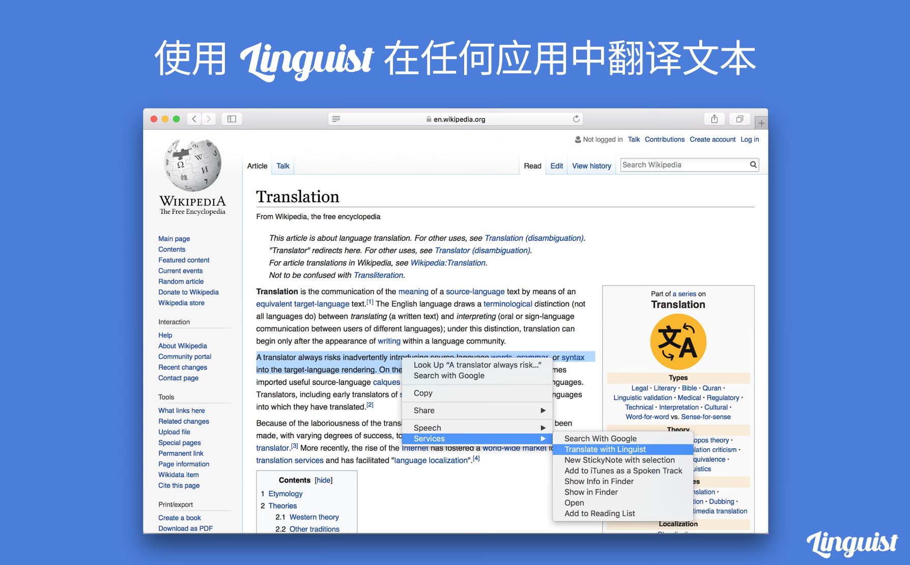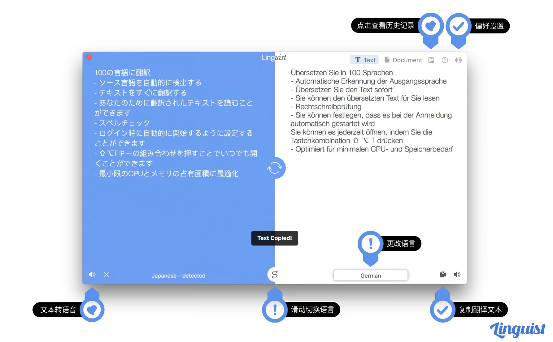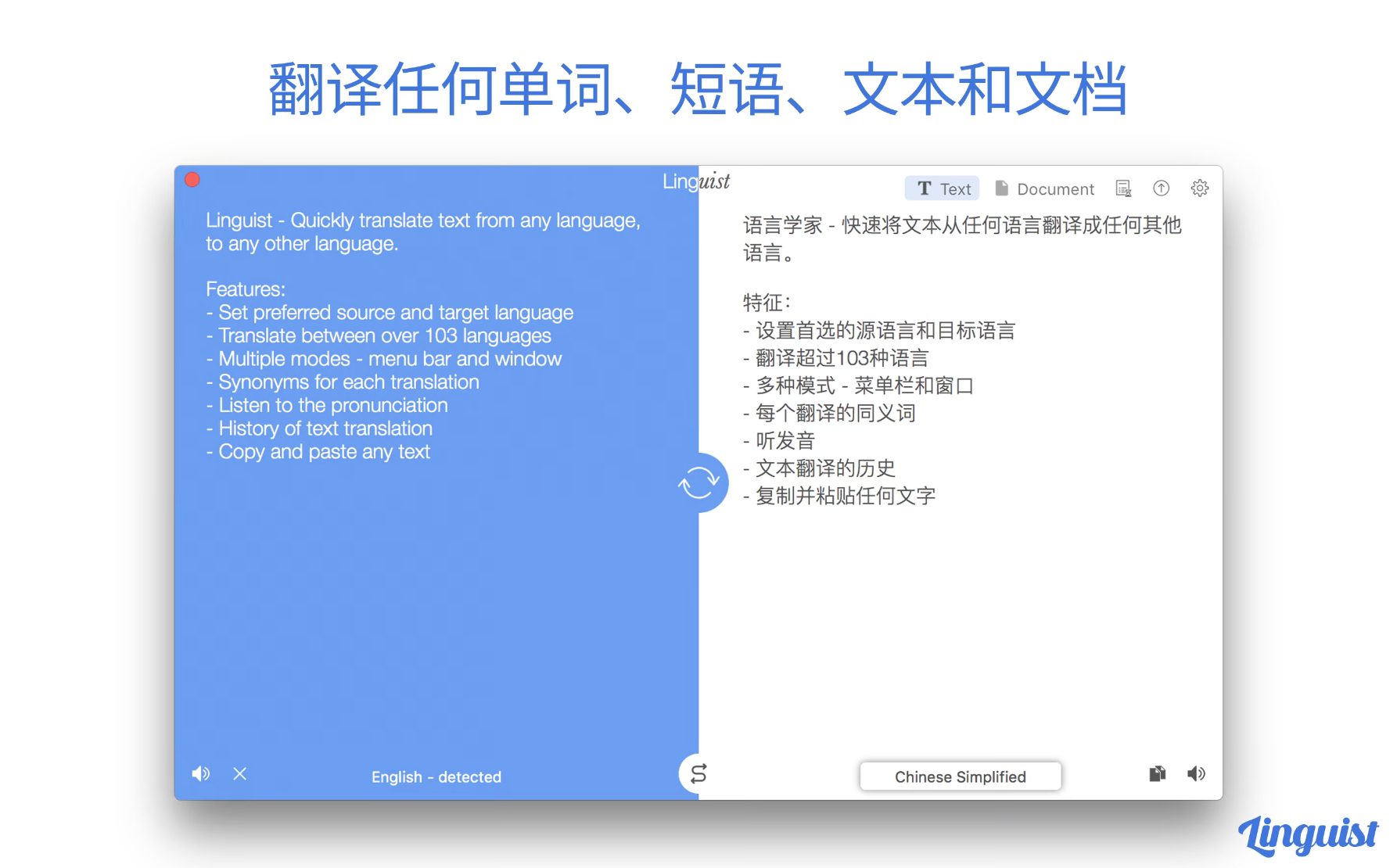 Linguist(语言学家)是一款专为macOS设计的轻量化菜单栏翻译工具,以零延迟跨应用翻译和多格式文档直译为核心优势,成为多语言工作者的效率引擎。🌍 支持全球103+种语言互译,无论是网页中的生僻词、PDF技术文档还是商务Doc文件,只需快捷键触发即可秒级获取翻译结果,彻底告别传统翻译软件的繁琐切换。💡 其独创的 “悬浮取词”技术 和 离线隐私保护模式 更是让跨语言沟通如母语般自然流畅,重新定义 Mac高效翻译工具 的标杆!