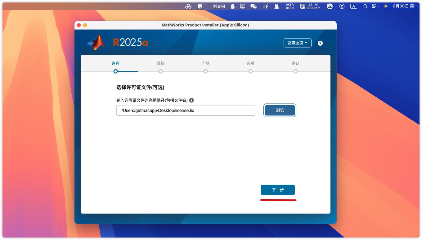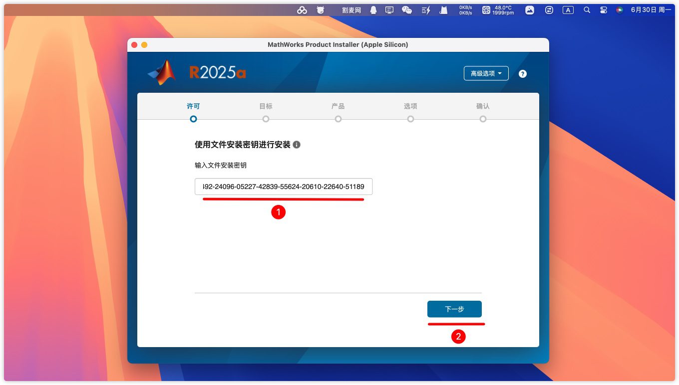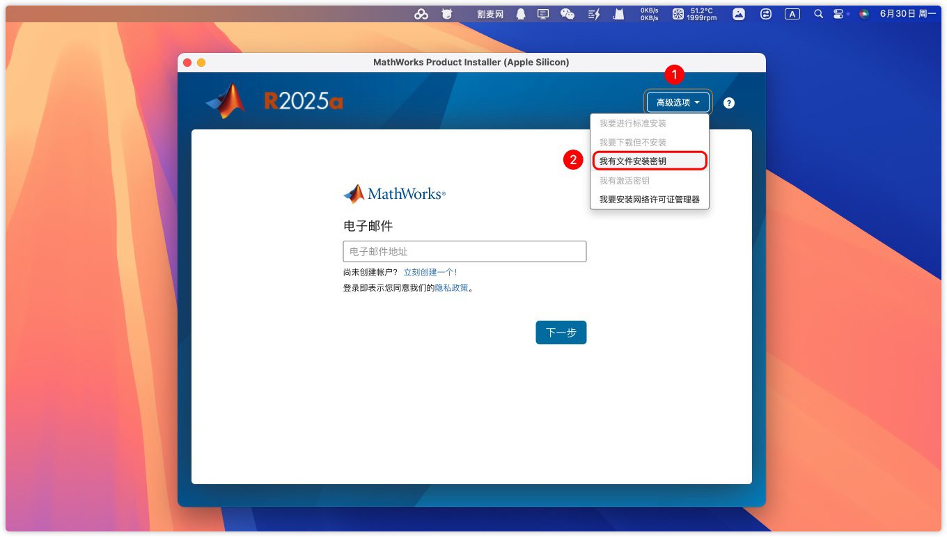 2.弹出一个MATLAB R2025安装程序,在高级选项里选择我有文件安装密钥