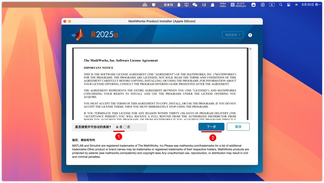 3.选择是,同意MATLAB R2025 协议,点击下一步