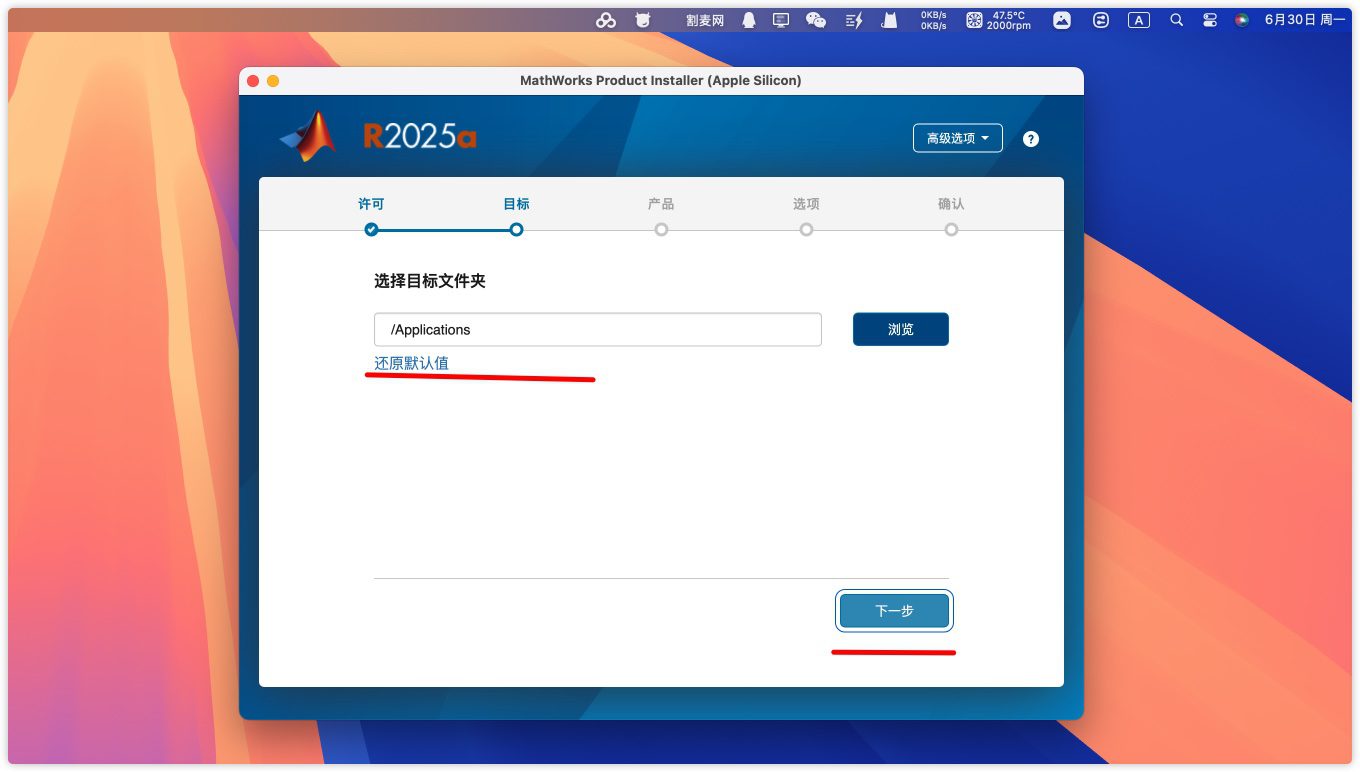 8.选择默认安装路径为Applications,点击下一步