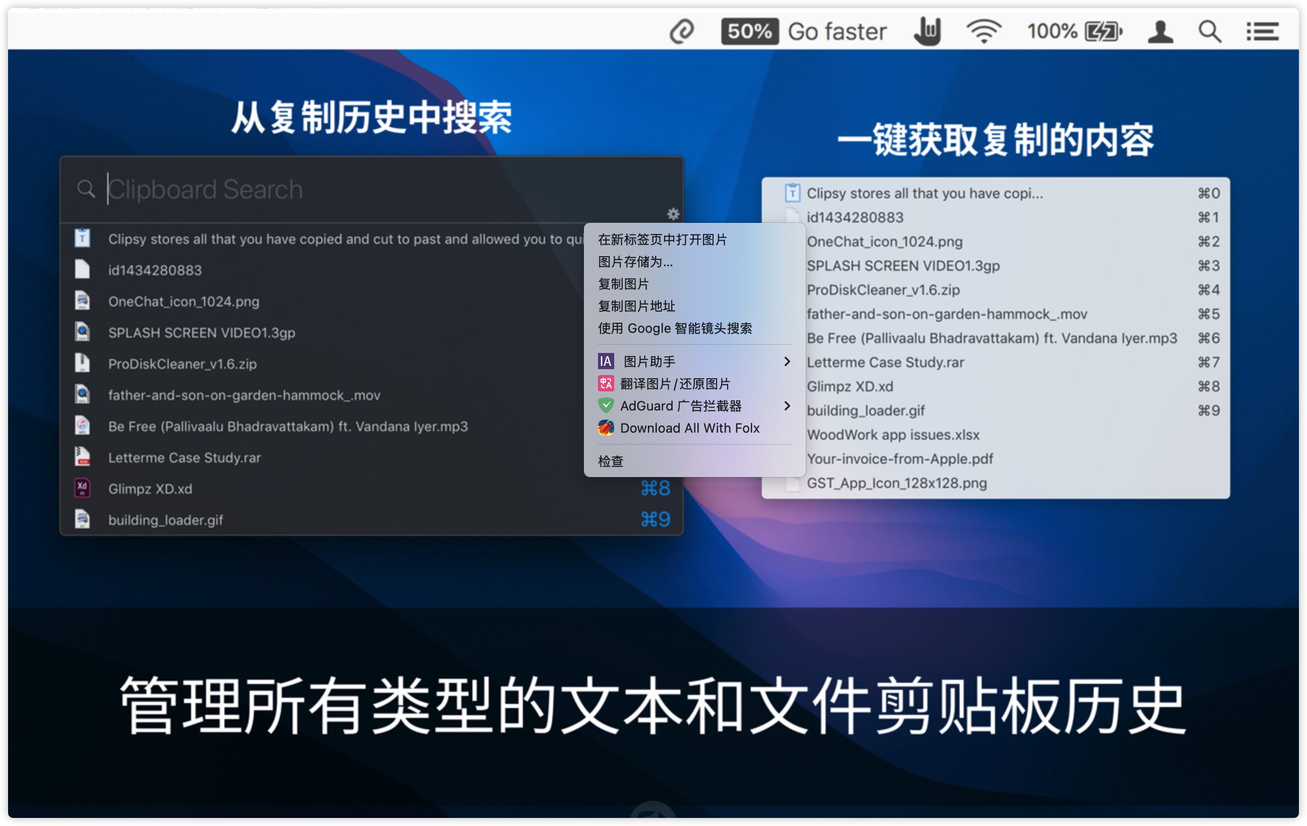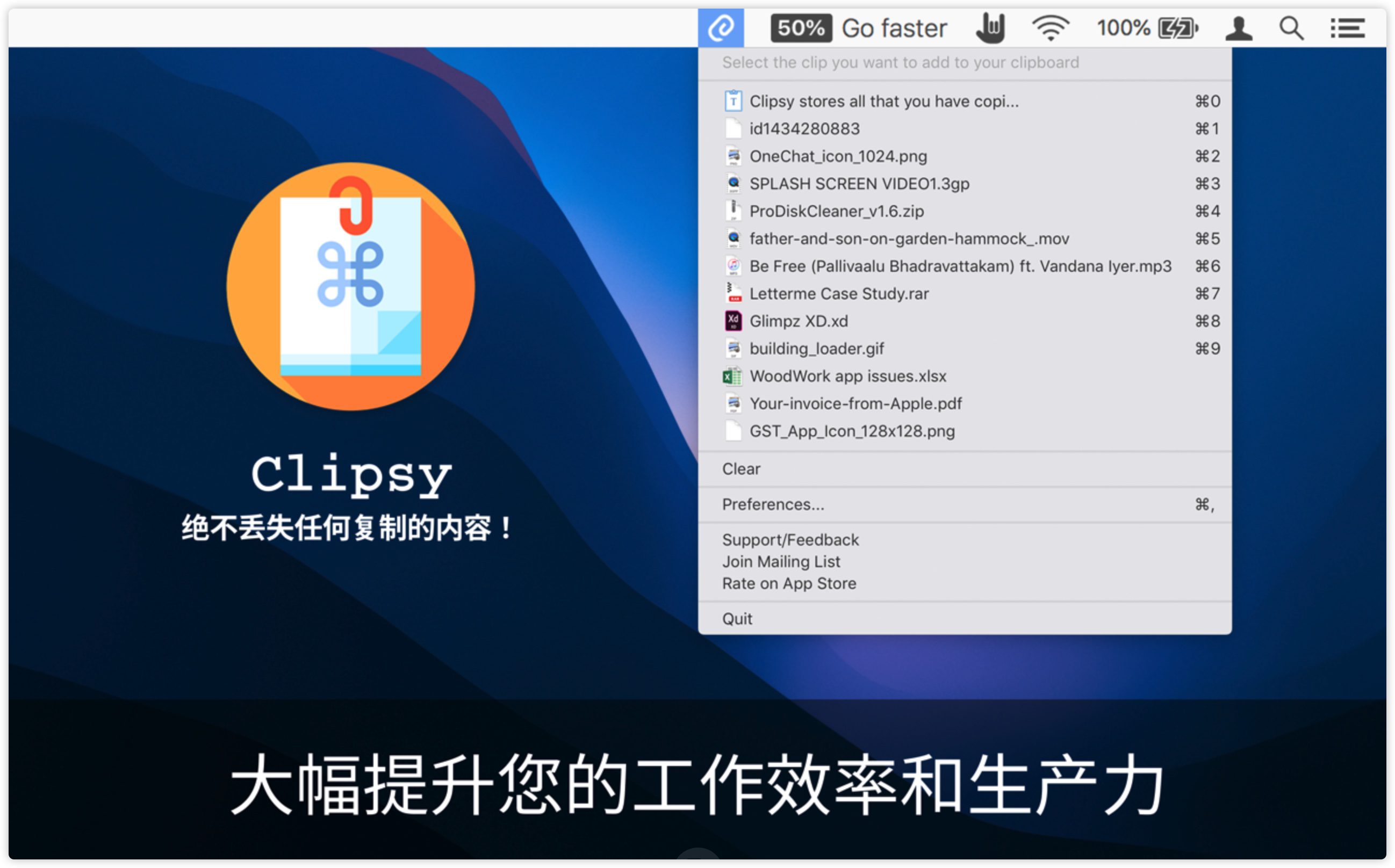 ✨ 还在为频繁重复复制粘贴而抓狂?Clipsy for Mac 正是你需要的剪切板历史管理工具!这款轻巧高效的软件彻底解放了你的复制粘贴操作,自动记录每一次复制的内容——无论是代码片段、图片、客户邮件还是设计素材。告别丢失剪贴内容的烦恼,Clipsy 用极简界面和智能管理,让信息流转效率飙升,成为提升Mac剪贴板管理体验的必备利器。