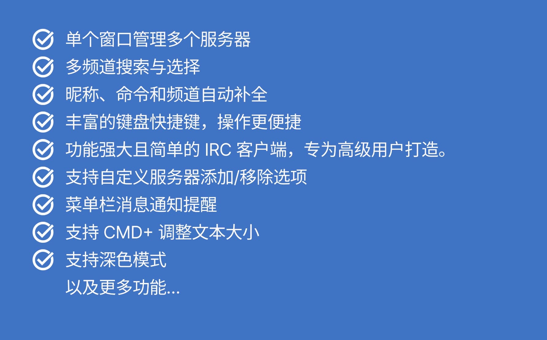 💻厌倦了臃肿的聊天工具?getIRC-IRC Client 是一款轻量高效的专业IRC聊天客户端工具,专为追求纯净通信体验的用户设计。它采用极简主义界面,却提供多服务器并行连接与实时聊天同步的核心能力,让您零延迟参与开源社区或技术团队讨论。相较于通用通讯软件,其核心优势在于超低资源占用与无干扰的专注环境,堪称Mac上极简主义IRC工具的标杆!