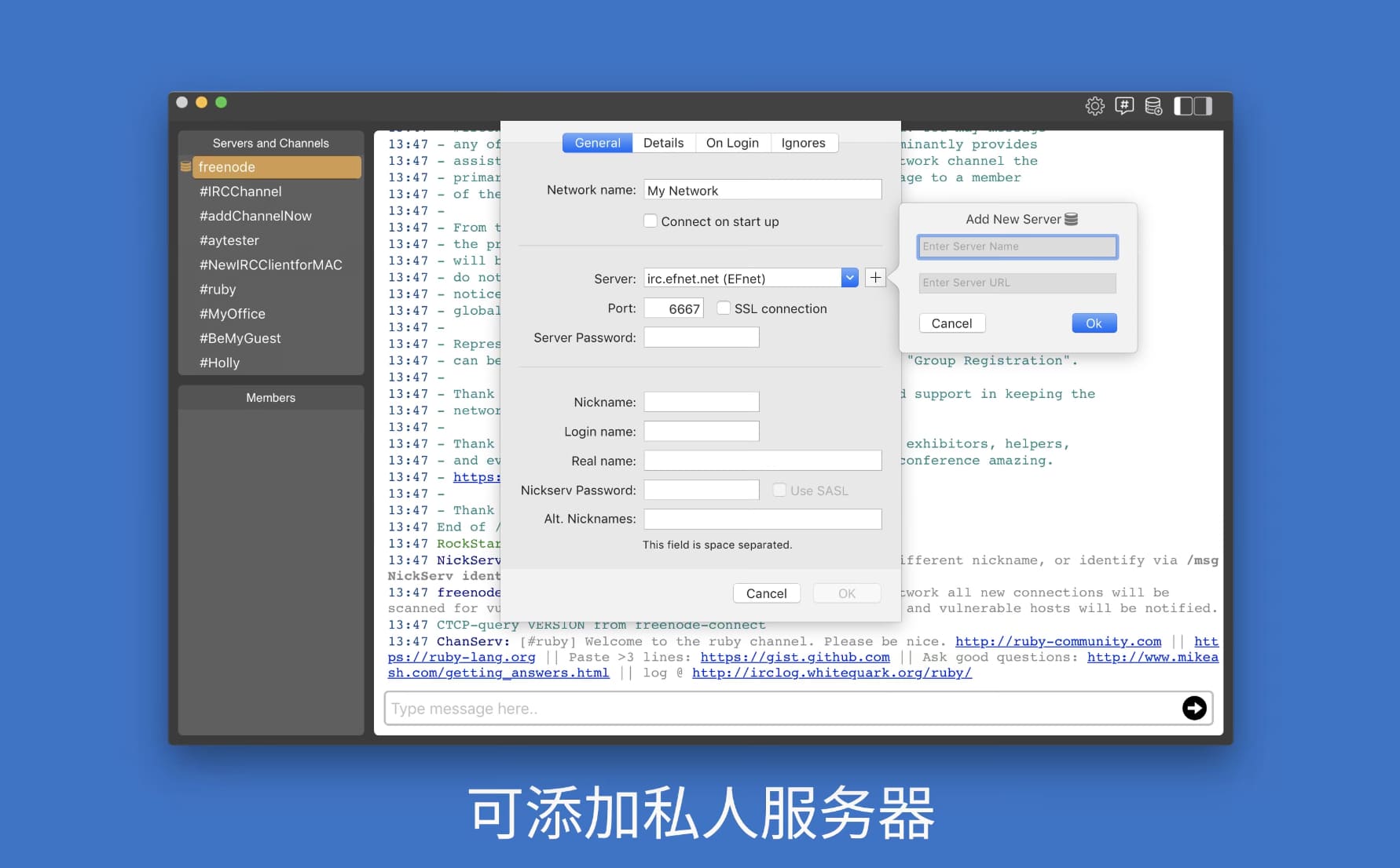 ✅ 自定义服务器集群:一键保存Freenode、Libera等主流IRC服务器配置