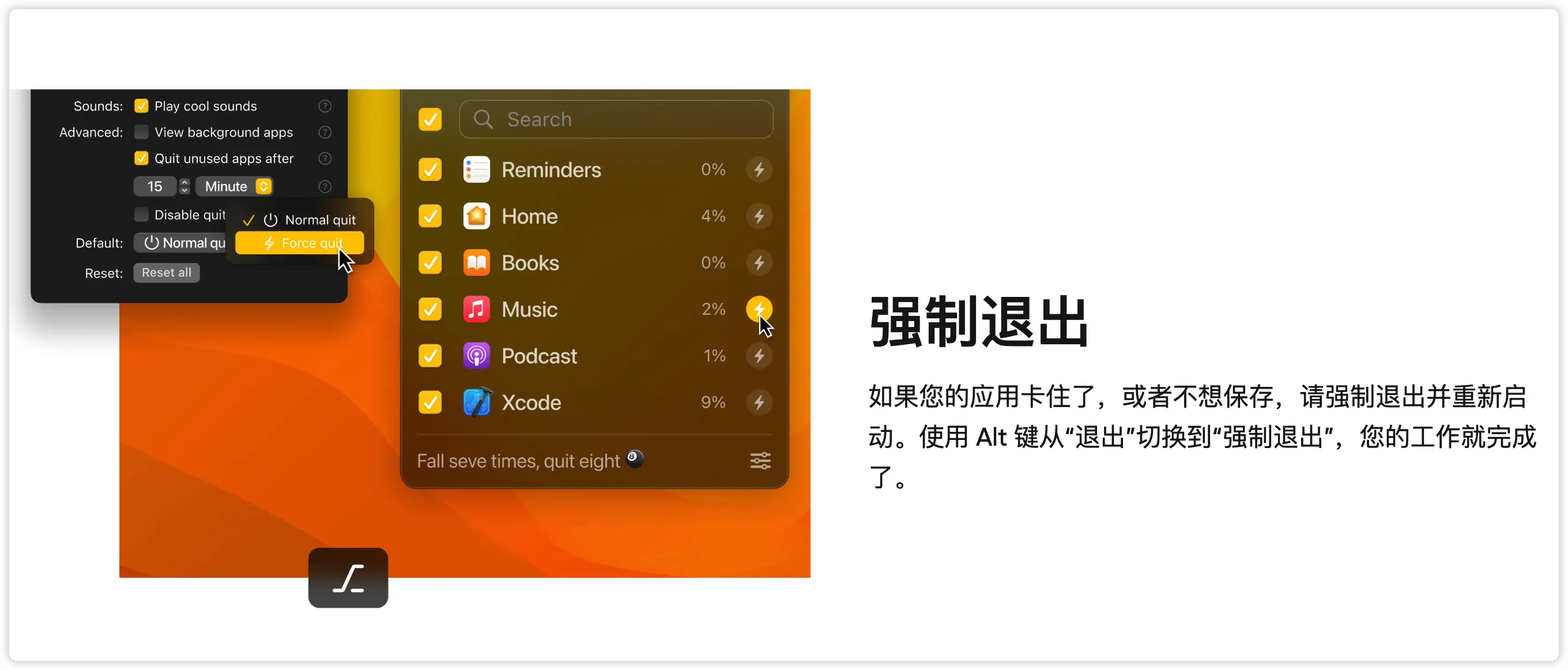 按住Option键点击退出按钮,可触发「强制模式」——彻底清除应用残留进程(解决某些软件假死状态)!