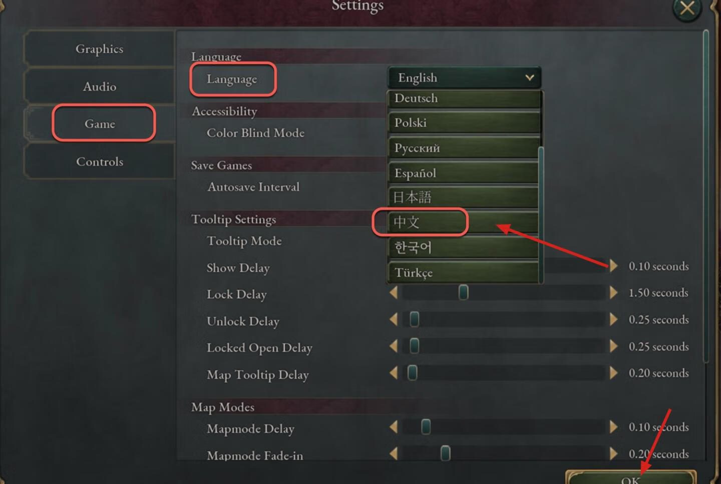 选择game-Language-中文,点击OK,退出游戏,重新打开游戏,就是中文。