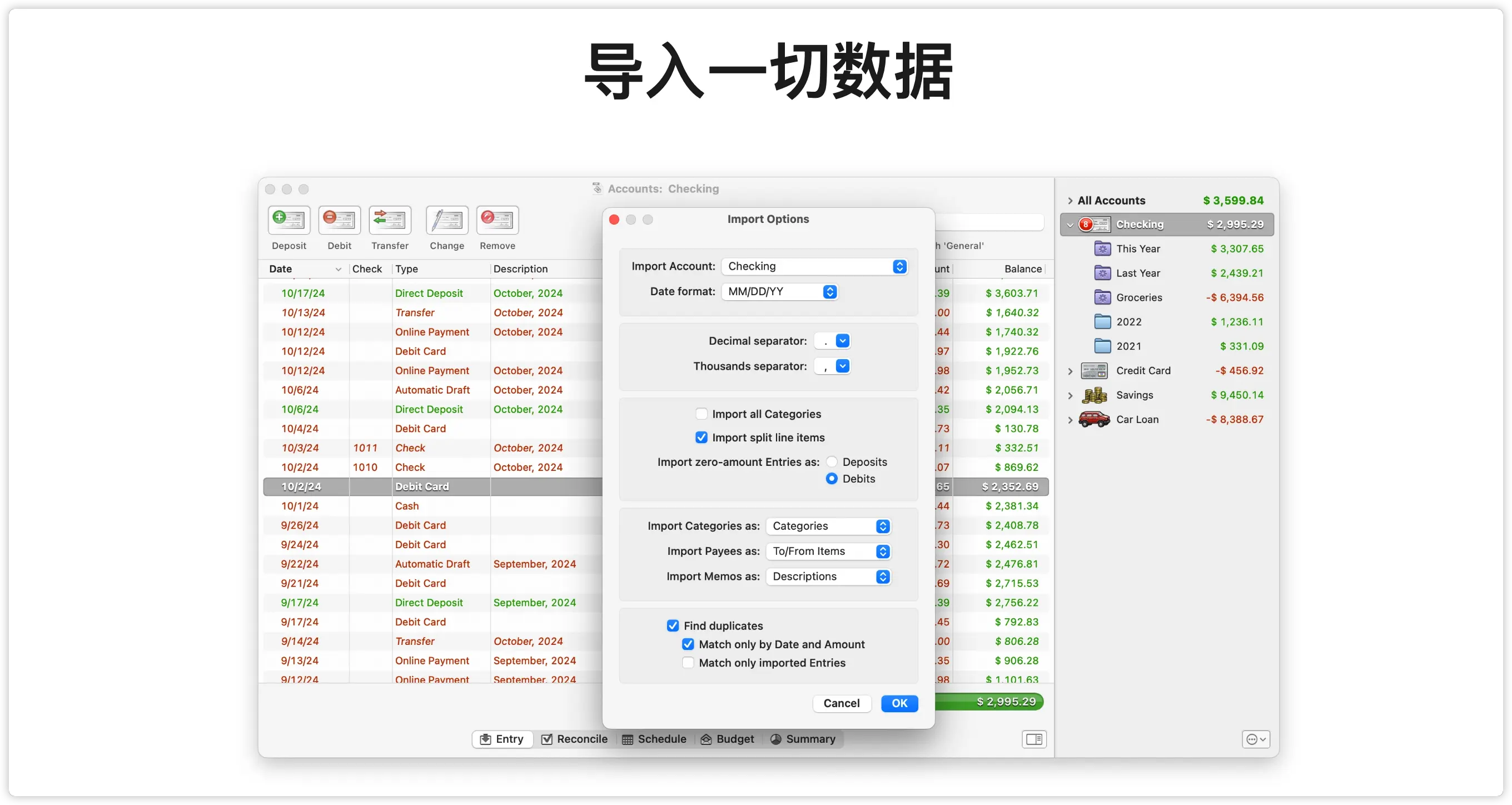 ✅ 多维度交易管理:支持550+银行模板导入(OFX/QFX/CSV),自动同步历史数据