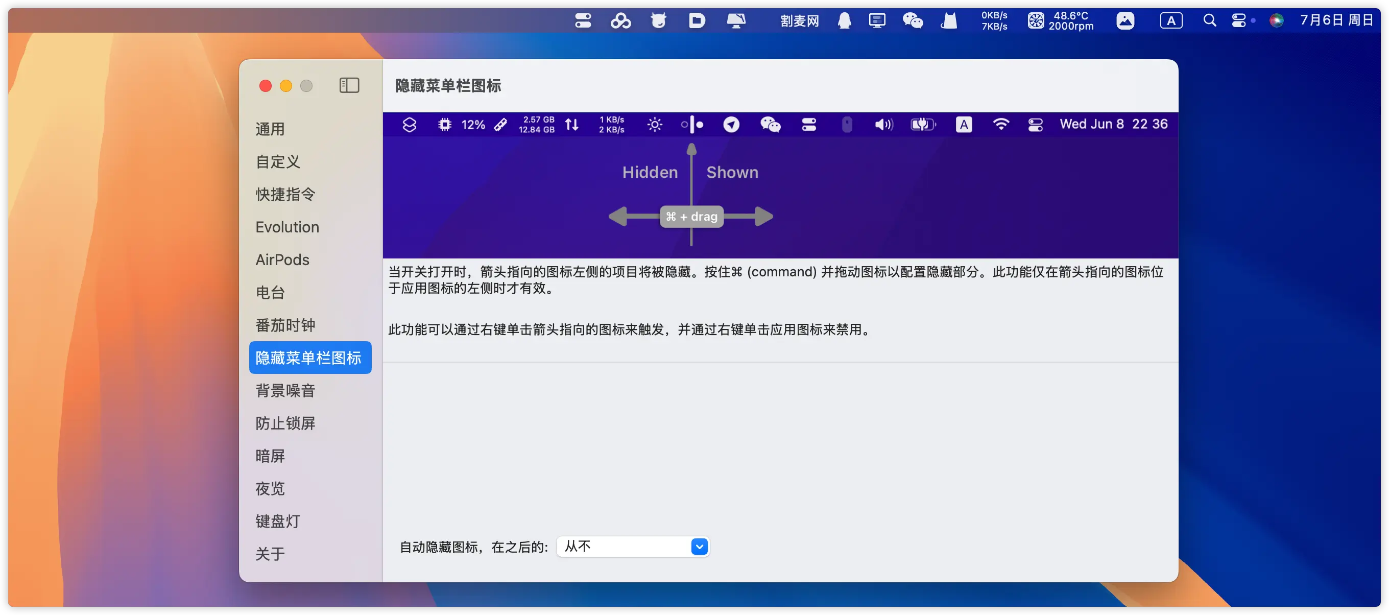 一键隐藏桌面:瞬间清理杂乱图标,专注当前任务保持亮屏模式:防止演示/阅读时屏幕休眠中断AirPods智能切换:🎧 快速在已配对设备间切换耳机连接显示/隐藏系统文件:开发者资源调取更高效暗色模式秒切:根据环境光线快速切换视觉主题