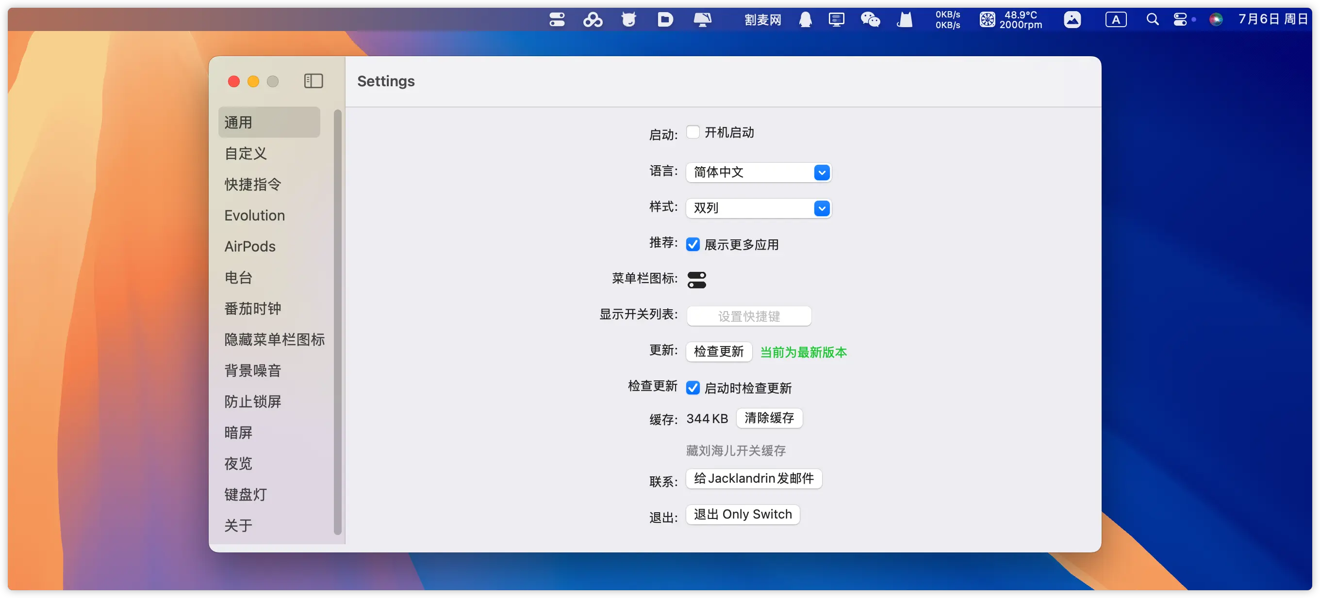 Only Switch 是一款专注于 macOS菜单栏效率工具 的创新软件,它彻底简化了繁琐的系统设置切换流程。🌟 通过将隐藏桌面、保持亮屏、AirPods快速切换等高频操作整合至菜单栏一键面板,解决了用户反复打开系统偏好设置的痛点。其 零学习成本的轻量化设计,让效率提升触手可及,尤其适合追求极简工作流的Mac用户。