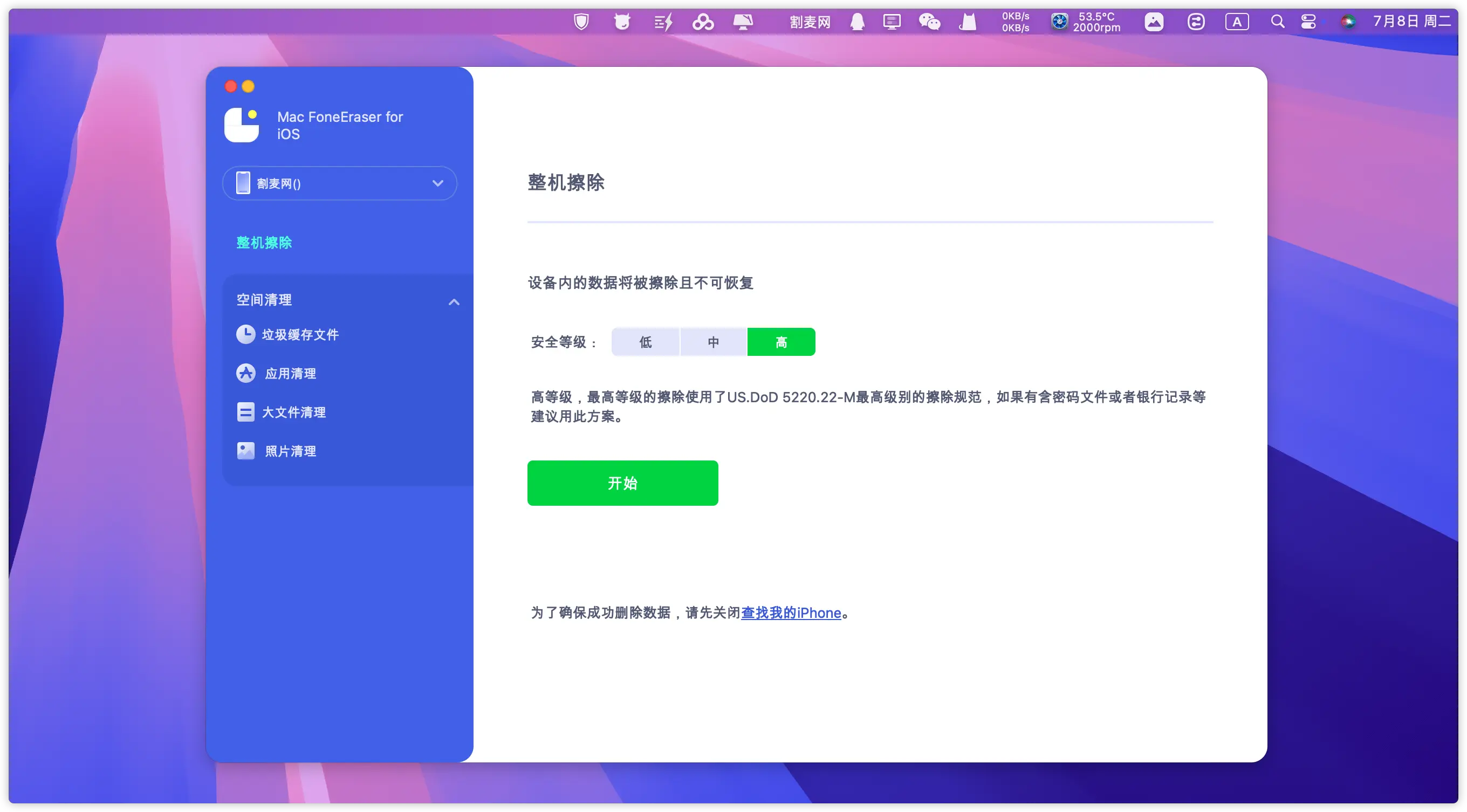 设备转售准备:连接iPhone后自动检测型号,智能推荐匹配的擦除强度(如iPhone 15 Pro建议7次覆写)📱 -