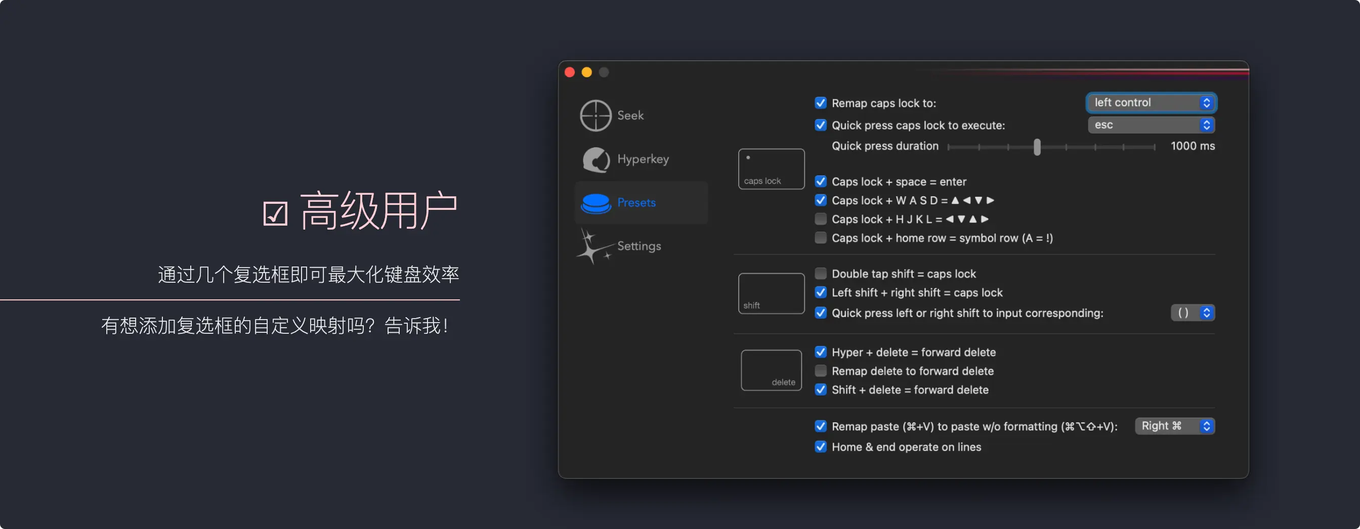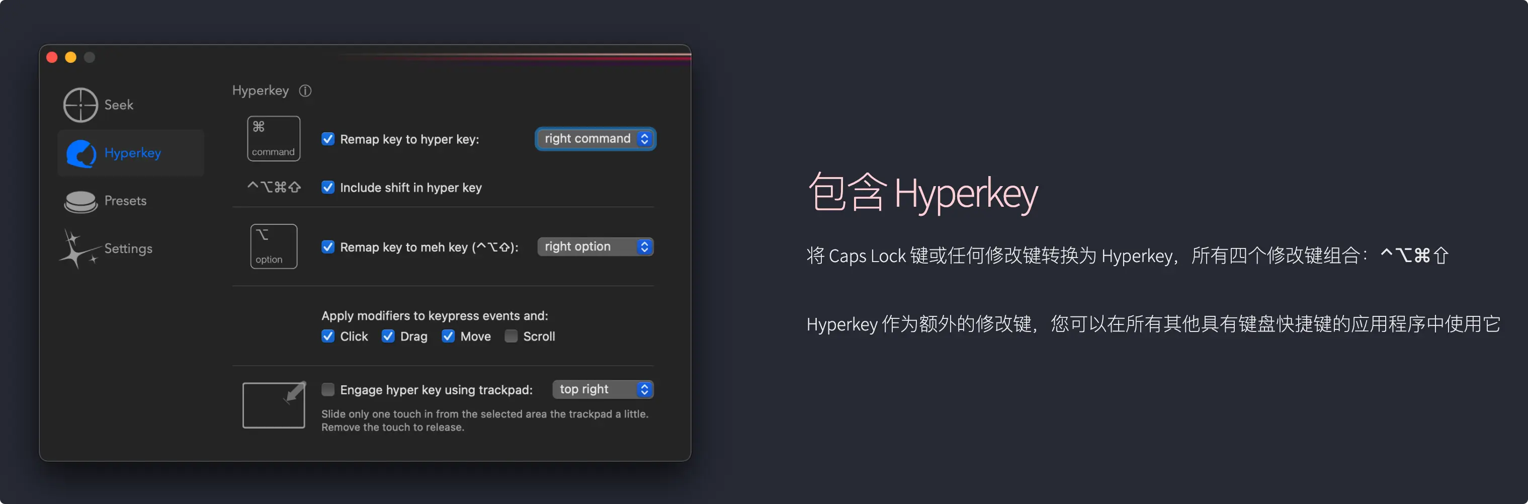 支持自定义修改键行为,适配Keyboard Maestro等自动化工具