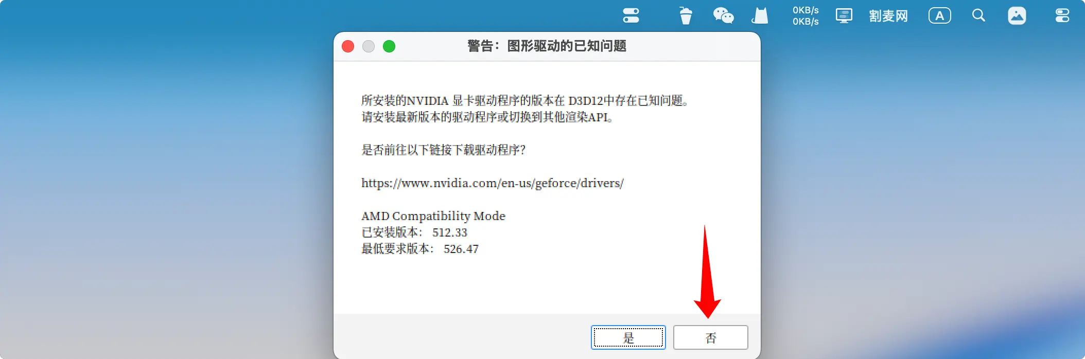 游戏启动时会弹出警告,提示图形驱动有已知问题并要求更新。直接点“否”忽略即可。