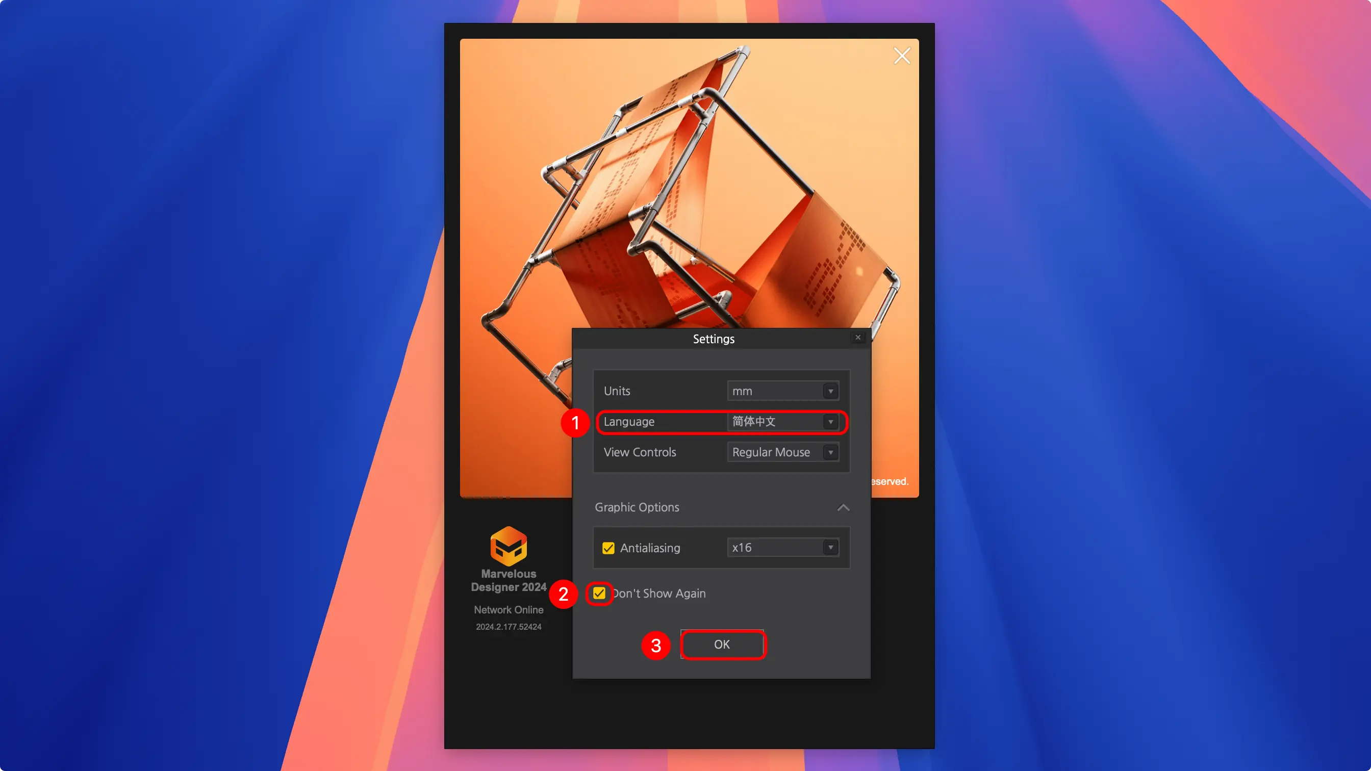 在弹出的Settings窗口中,Language下选择简体中文勾选Don't show Again点击OK,即可使用软件