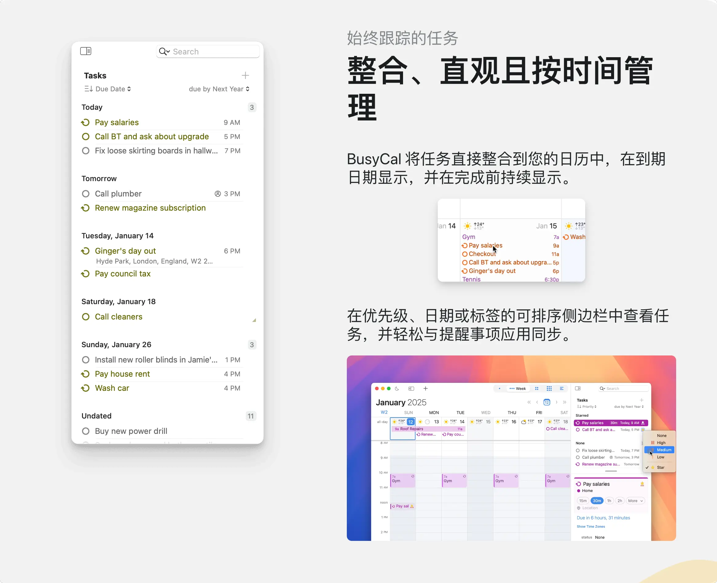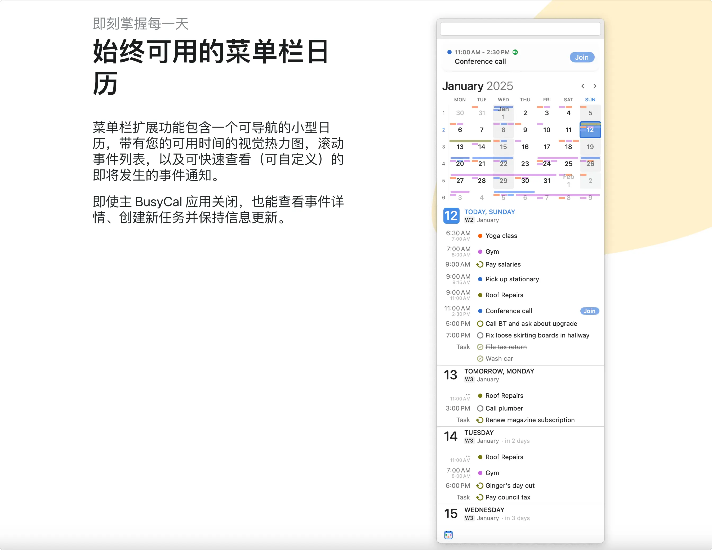 🎯 BusyCal 是 macOS 平台上专业级任务日历管理工具的标杆,被誉为「日历应用中的瑞士军刀」🔧。它突破基础日程记录,深度融合任务管理、多平台同步与智能环境感知能力,尤其以无缝衔接 iCloud/Exchange/Google 日历的实时协作能力傲视同类软件。更通过独家集成精准天气预报🌦️等细节设计,让日程规划真正融入生活场景,彻底告别碎片化工具切换,堪称效率控的终极中枢✅。