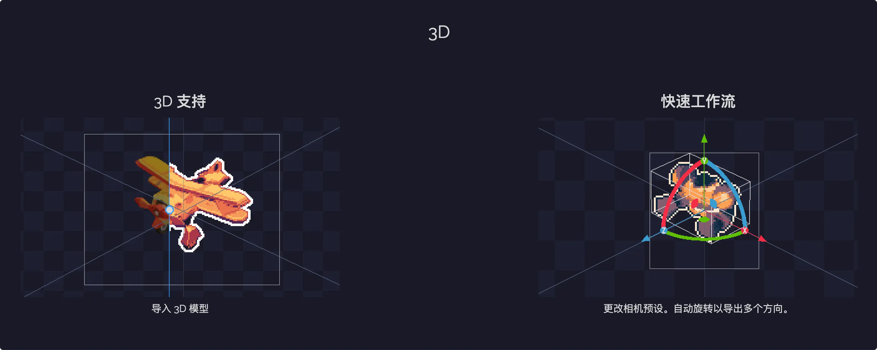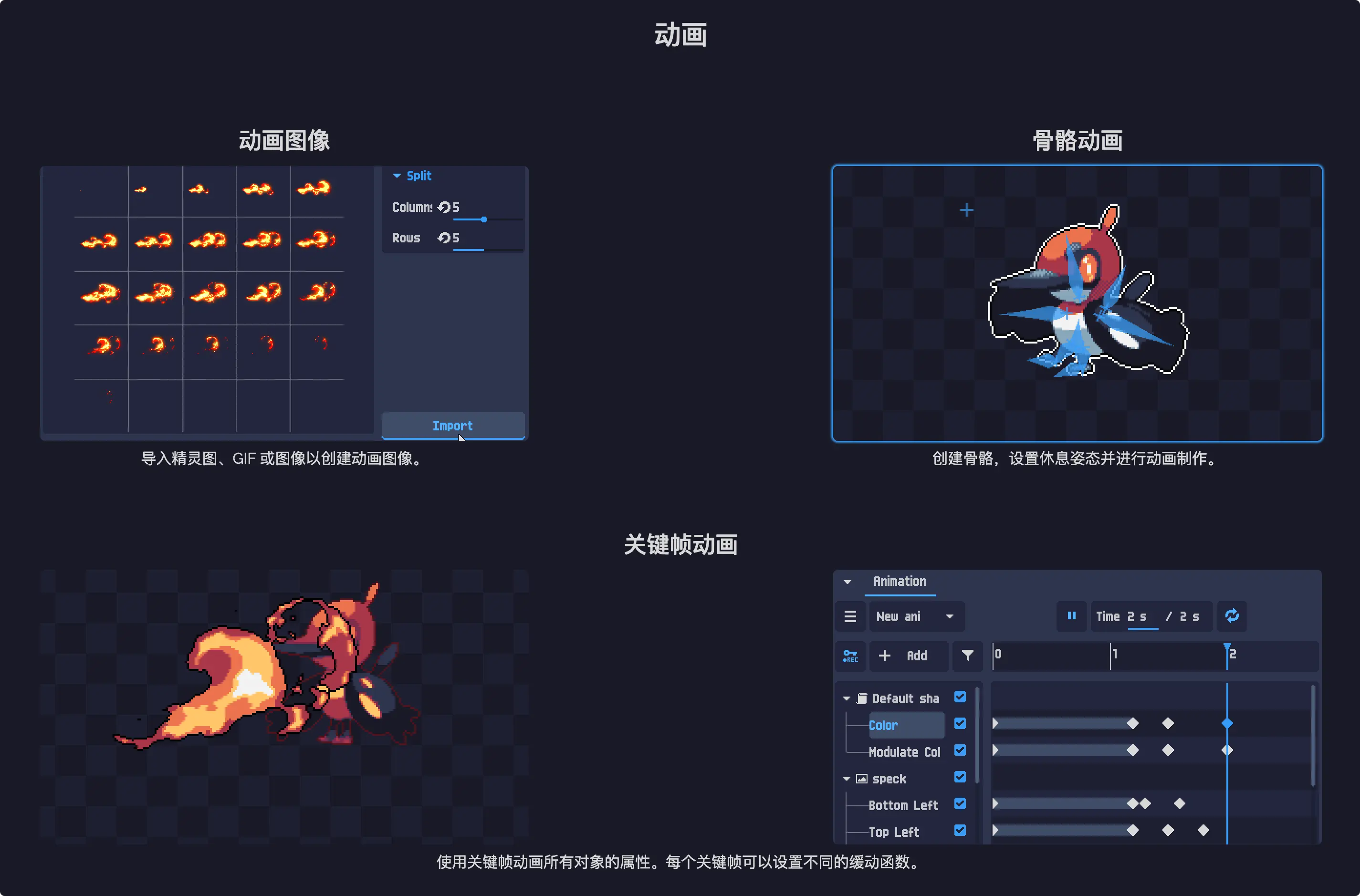 🌐多格式兼容性:支持JPG/PNG转像素画,GIF/精灵表转骨骼动画,并可导出为MP4、GIF或游戏引擎专用序列帧。