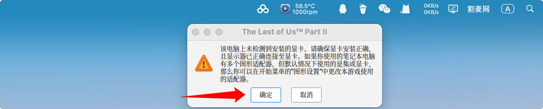 游戏启动时会弹出警告,提示该电脑上未检测到安装的显卡。直接点“确定”忽略即可。(已支持 DLSS 及光线追踪)