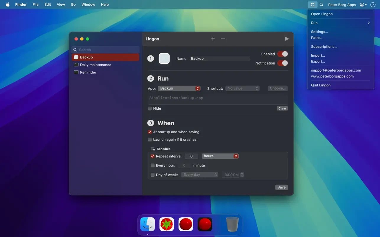 launchd守护进程,实现应用程序、脚本及命令的自动化调度✨。与系统原生工具相比,其核心差异化在于支持崩溃自动重启、多条件触发规则(如特定时间/事件/网络环境)及Root权限任务执行,显著提升后台服务的稳定性与灵活性。无论是开发者部署定时脚本,还是普通用户管理开机项,Lingon X 以低学习成本提供企业级控制能力,成为优化工作流的效率神器🚀。