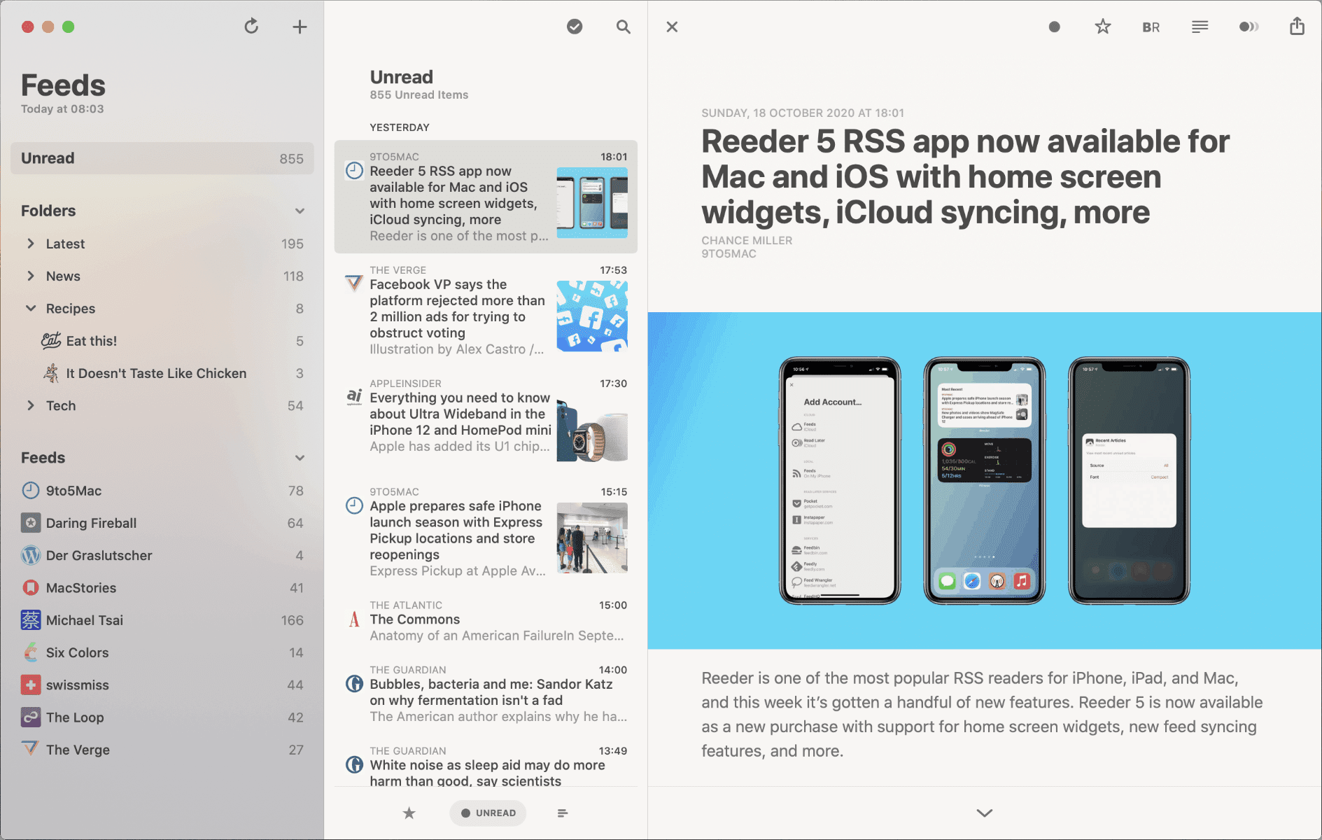 现在,借助Reeder,RSS阅读器和RSS阅读器,您可以控制新闻阅读,并在一个应用程序中阅读以后的客户端,现在支持iCloud同步。