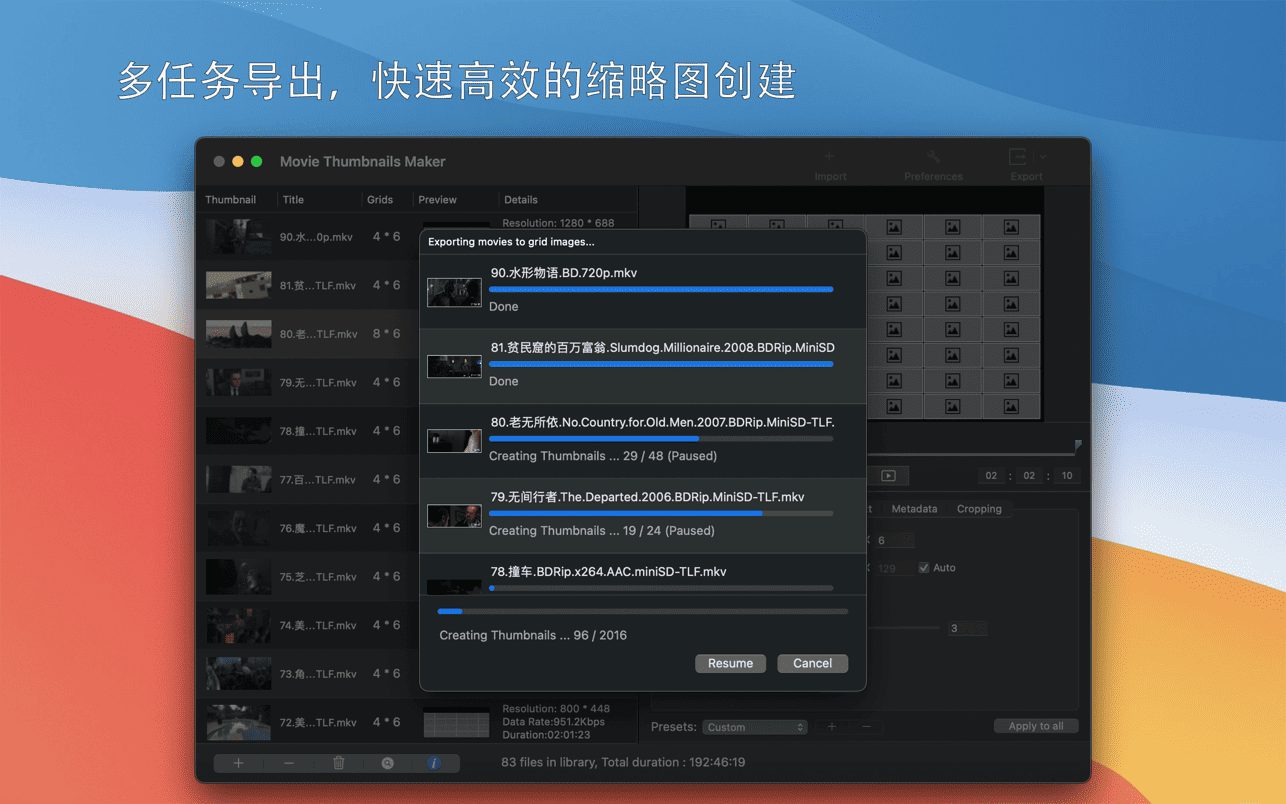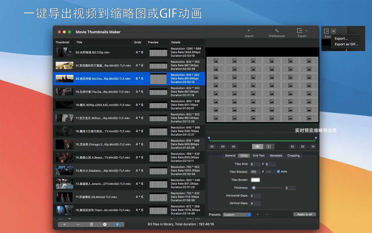 Movie Thumbnails Maker是视频缩略图批量生成神器,彻底革新影视素材管理方式!这款Mac专属工具支持AVI/WMV/MP4/MOV等全格式解析,通过拖拽式操作+自定义网格布局,3步生成专业级电影预览图。独创批量处理引擎可同时处理百部影片,视频缩略图制作效率飙升500%,影视从业者与自媒体创作者的必备效率武器!🚀