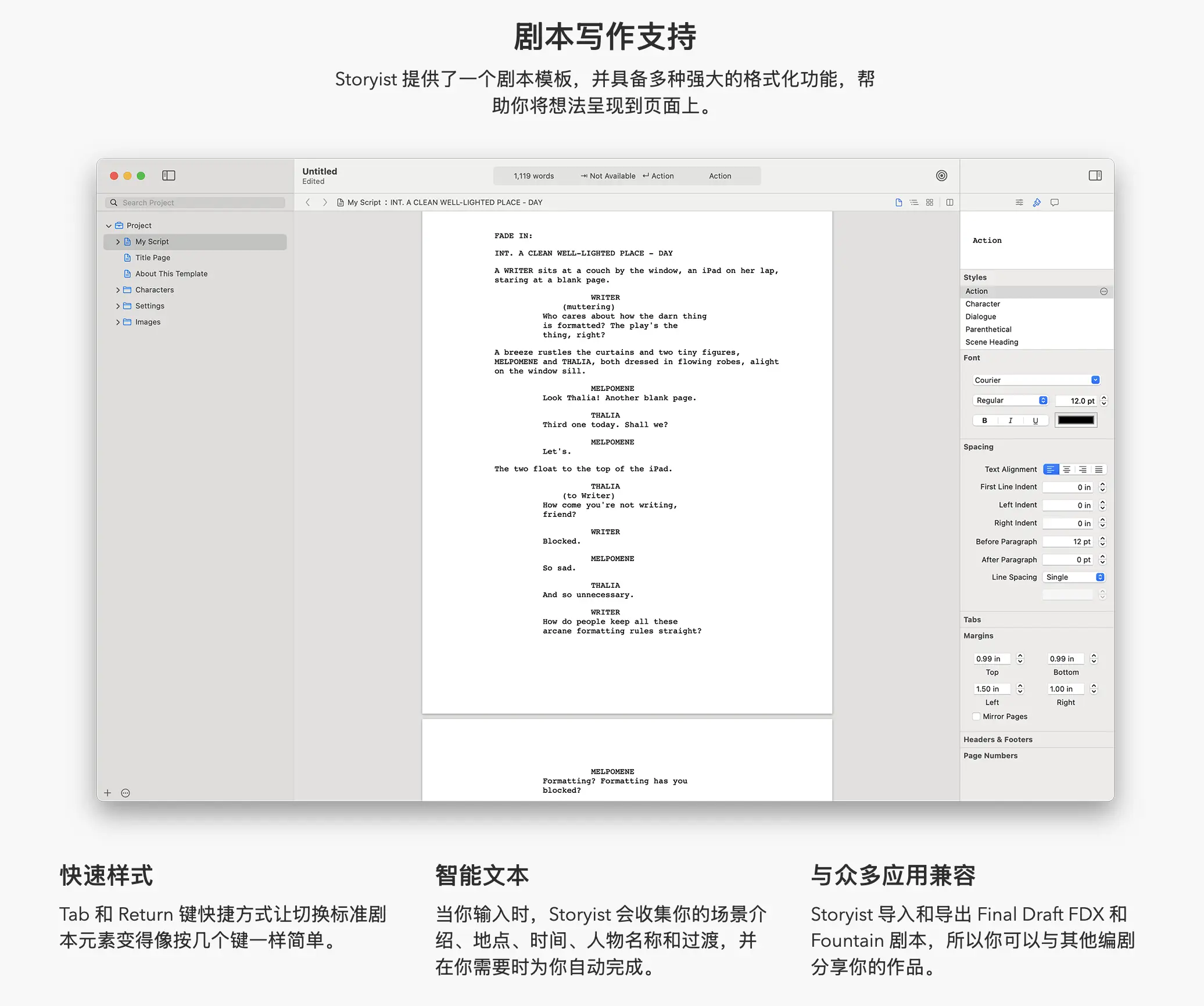 ✅ 生态无缝衔接:直接导入Scrivener项目、Final Draft剧本;导出Word/RTF时保留样式表,避免协作时格式崩坏。