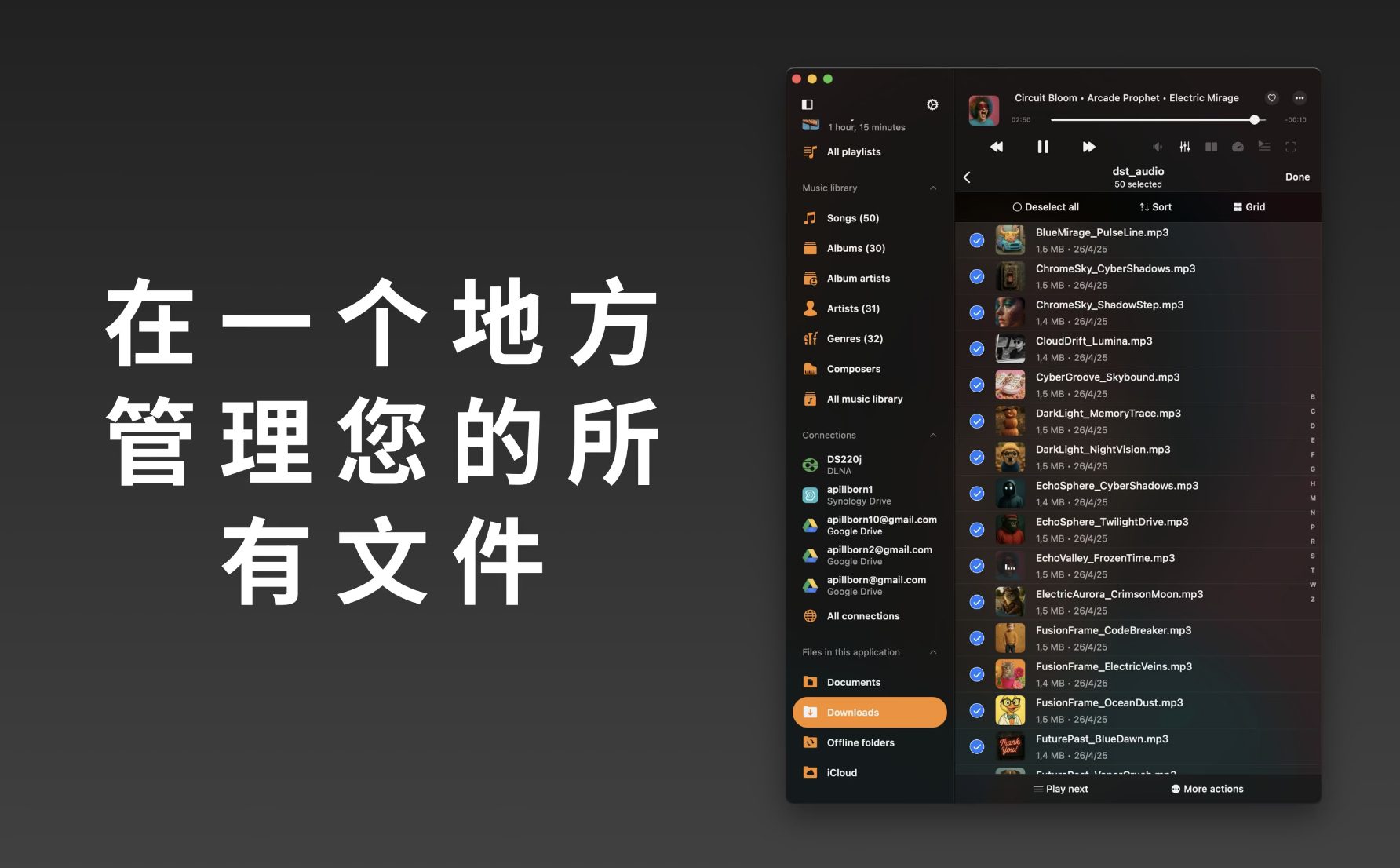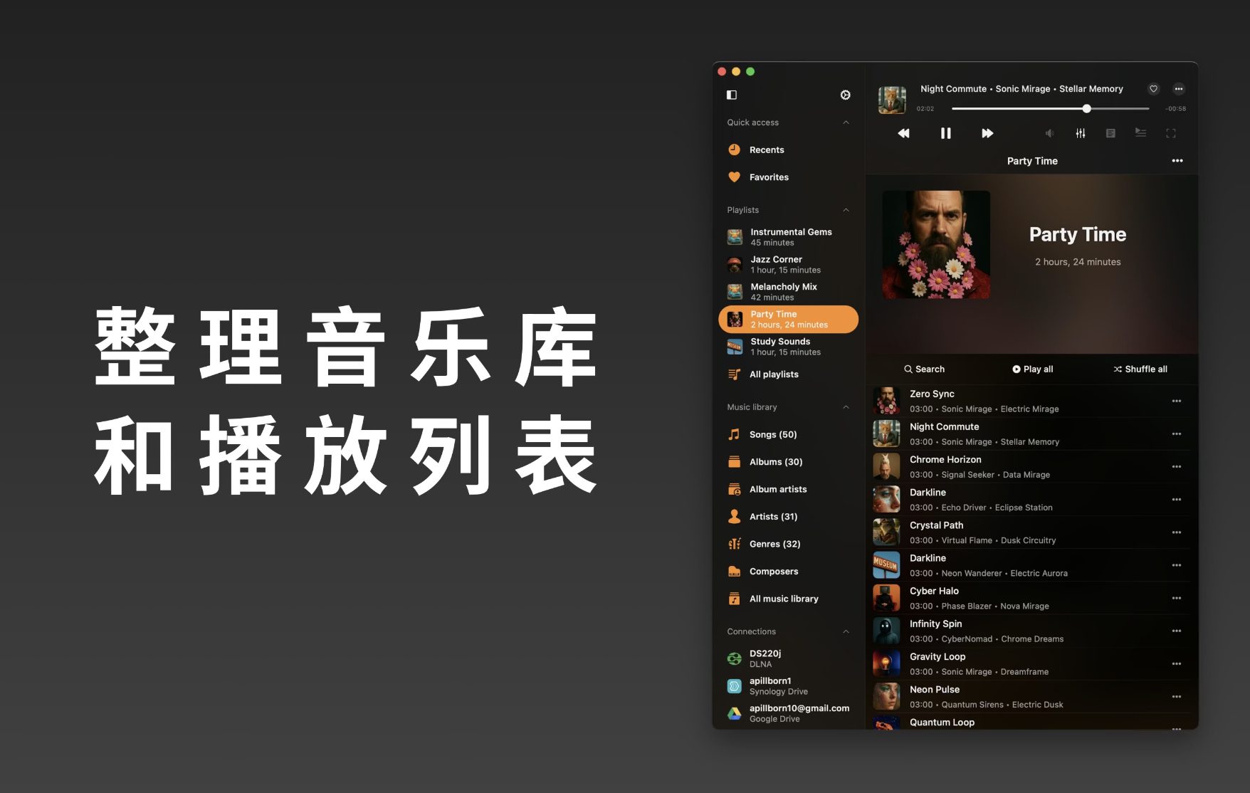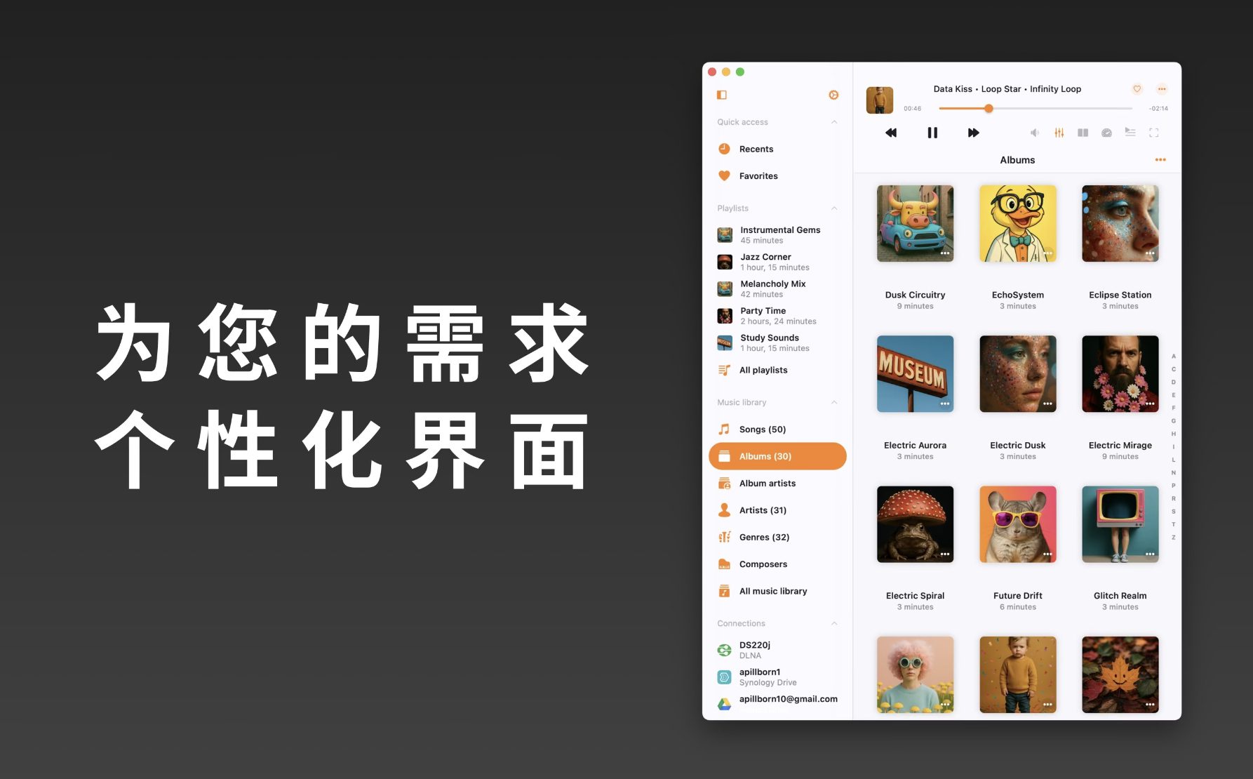 Flacbox是Mac平台上一款专业级无损音乐播放器,以全格式兼容性云端音乐库整合能力重新定义音频体验。它支持包括DSD、FLAC、ALAC等超20种高清音频格式,直接解码原生音源,同时无缝对接Google Drive、Dropbox等18种云服务及NAS存储,实现本地与云端音乐的智能同步管理🎵。其核心差异化在于专业音频引擎——384KHz采样率配合7声道输出的硬件级解析力,叠加可定制EQ均衡器与低音增强技术,让普通耳机也能呈现录音室级声场。用户可彻底摆脱存储空间限制,真正实现“云端曲库,耳畔高保真”的自由聆听💎。