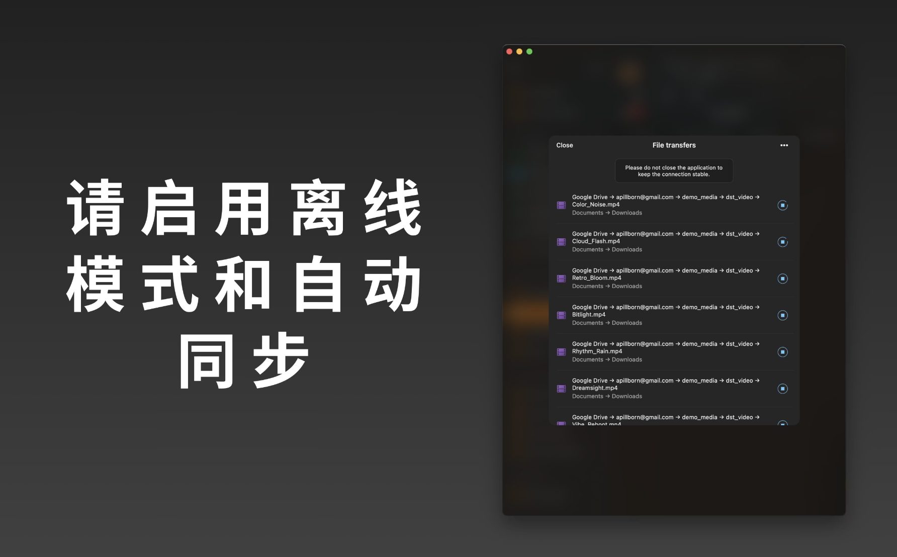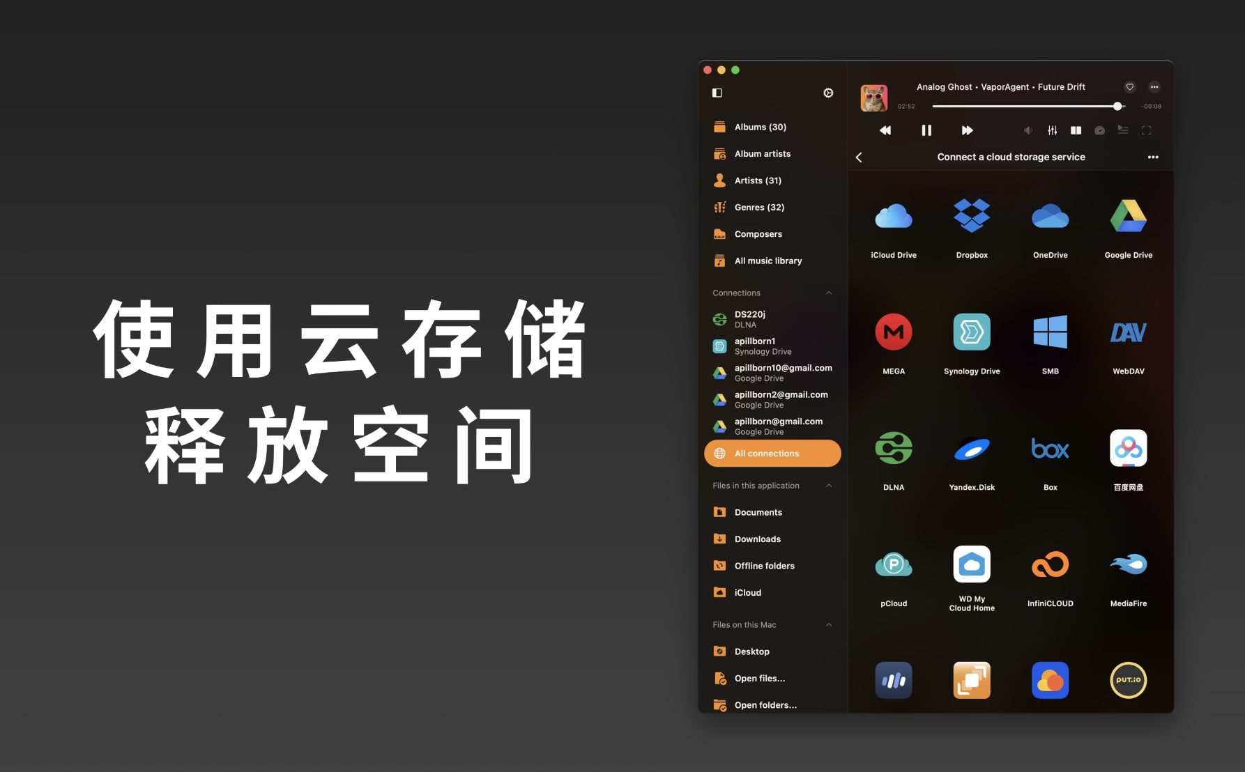 • 支持的云服务:iCloud Drive、Google Drive、Dropbox、OneDrive、Box、MEGA、Cloud Mail.ru、百度网盘、InfiniCLOUD、Yandex.Disk、WD MyCloud Home、Put.io、MediaFire、MyDrive、pCloud、HiDrive、OpenDrive。