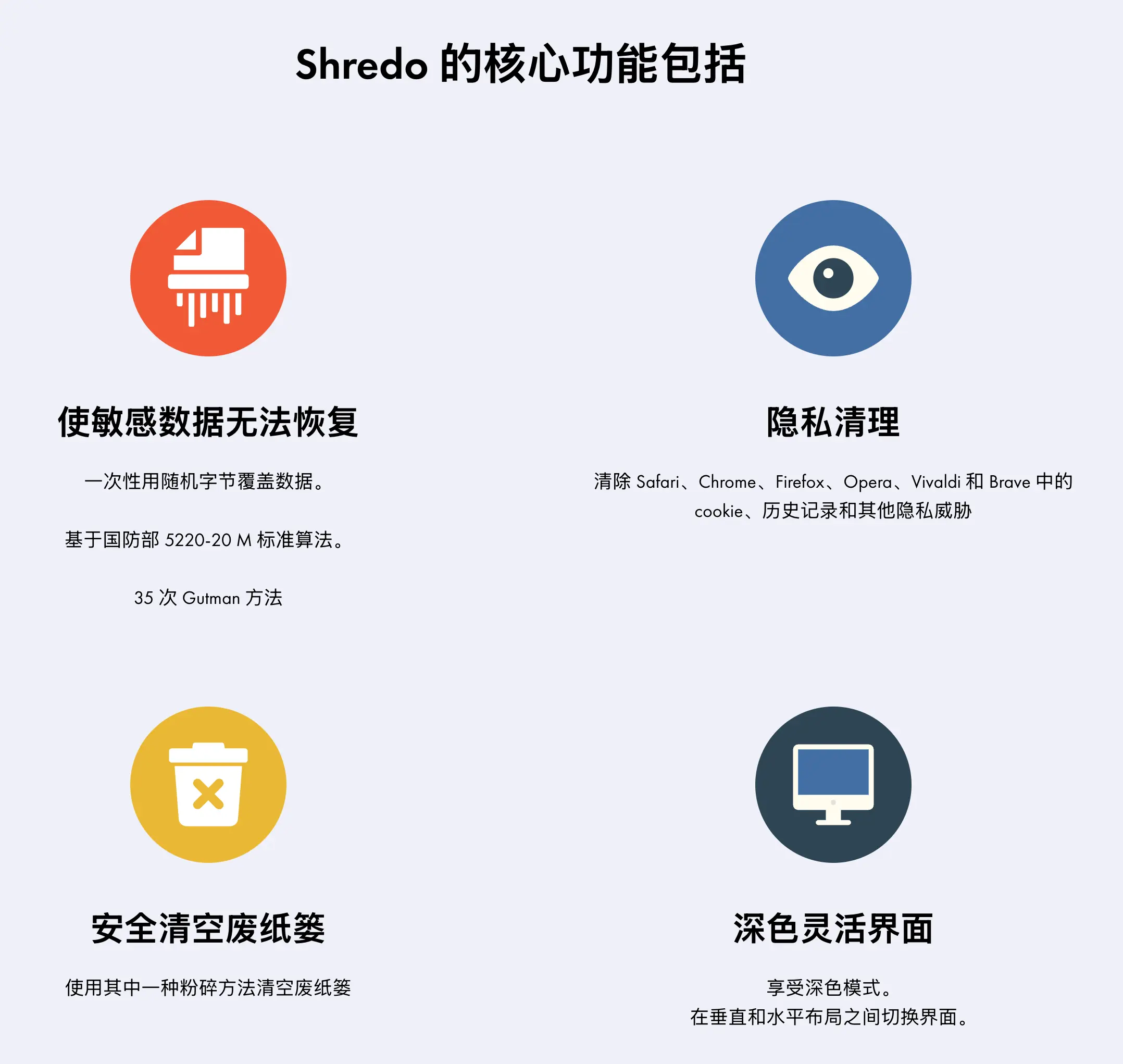 Shredo for Mac 是专业级文件粉碎工具💥,专为追求极致数据安全的用户设计。与普通删除工具不同,它采用军用级擦除算法彻底破坏文件结构,杜绝任何恢复可能。其核心优势在于「闪电粉碎速度」与「零学习成本操作」——无需复杂设置,文件拖拽即焚🔄,成为Mac用户清理敏感数据的首选文件粉碎机。无论是临时文档还是机密资料,一键物理级消失,守护隐私不留痕。