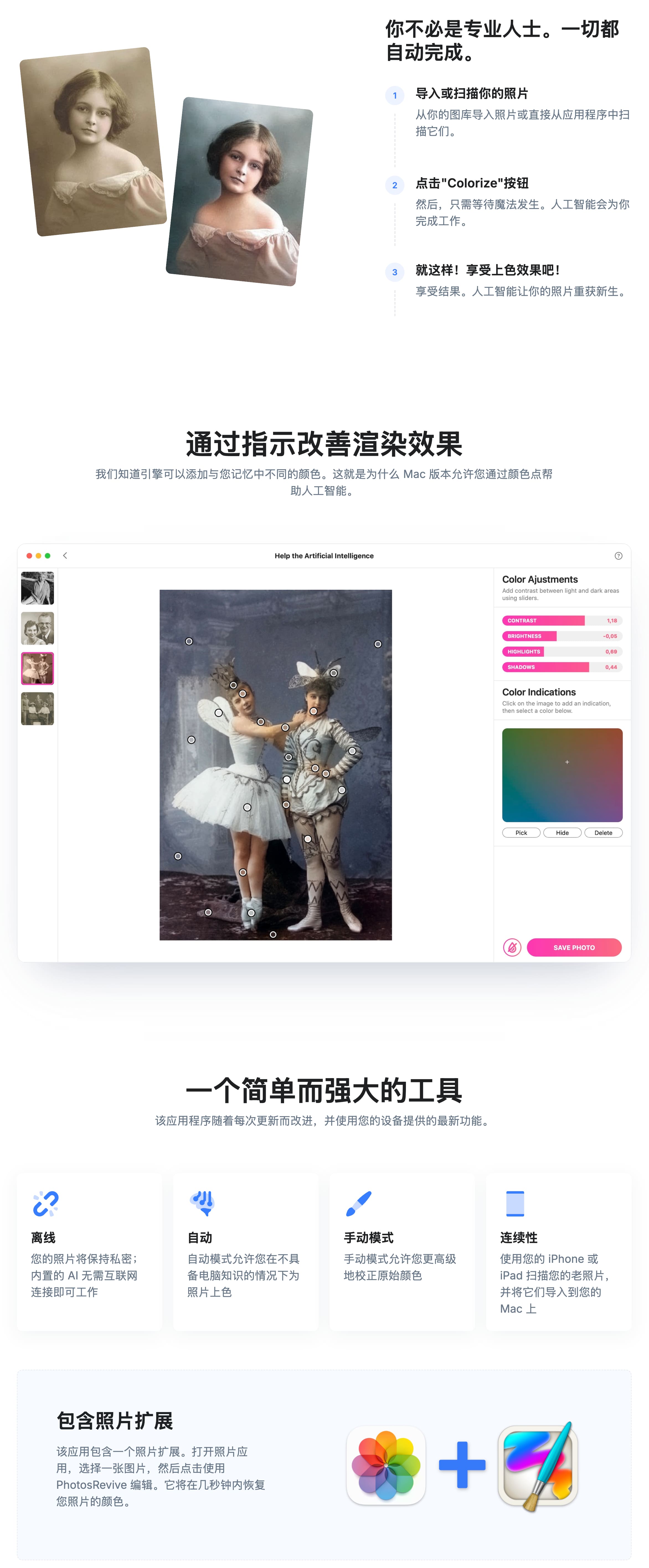 AI智能着色:应用先进的人工智能技术,自动分析照片内容并智能填充最符合现实的颜色,实现超逼真的着色效果。 -